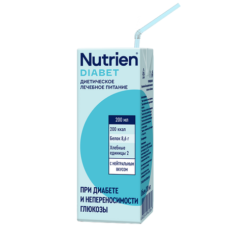 полноценное диетическое лечебное (энтеральное) питание при сахарном диабете 1 и 2 типа для поддержания нормального уровня сахара крови на всех этапах лечения и реабилитации. Может быть назначен пациентам с проблемами ЖКТ для нормализации микробиоты и моторики кишечника. Гликемический индекс 18,7. Ключевые особенности: • Углеводы (фруктоза+мальтоза) не вызывают быстрого и резкого повышения уровня глюкозы в крови, фруктоза не требует инсулин для усвоения. Низкий уровень сахаров обеспечивает низкий гликемический индекс. Профилактирует повышение сахара в крови. • Пищевые волокна нормализуют процесс пищеварения, обладают пребиотическим действием, замедляют скорость всасывания углеводов в пищеварительном тракте. • Белки представлены нативным молочным белком, который легко усваивается и обладает высокой биологической ценностью и биодоступностью. • Оптимальное соотношение ПНЖК (Омега 6, Омега 3 жирные кислоты), витаминно-минеральный комплекс обеспечивают выраженный антиоксидантный и иммуномодулирующий эффект. • Хорошая органолептика (не приторные, низкая вязкость) способствует высокой приверженности к диетотерапии. • Не содержит глютен, лактозу и холестерин в клинически значимых количествах. • Не содержит искусственных красителей и ароматизаторов. Форма выпуска: Жидкая готовая смесь объемом 200 мл в упаковке Tetra Pak с нейтральным вкусом. К упаковке прилагается одноразовая трубочка.