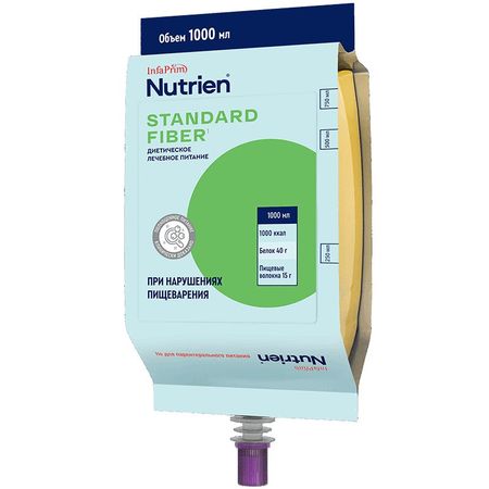 Nutrien® Standard (Нутриэн® Стандарт c пищевыми волокнами) – полноценное лечебное питание, готовое к употреблению для профилактики и устранения недостаточности питания, а также коррекции состава рациона питания. Жидкая готовая смесь объемом 1000 мл в упаковке Gualapack. — При подготовке к операции и в период послеоперационной реабилитации — Заболевания желудочно- кишечного тракта: холецистит, панкреатит — При сложности приема стандартных приемов пищи — Неврология: инсульт, депрессия, анорексия, рассеянный склероз, инфекции ЦНС — Состояния, связанные с потерей аппетита и/или отказом от приема пищи: онкологические заболевания, неврологические заболевания, психические расстройства — Сложности питания в пожилом возрасте