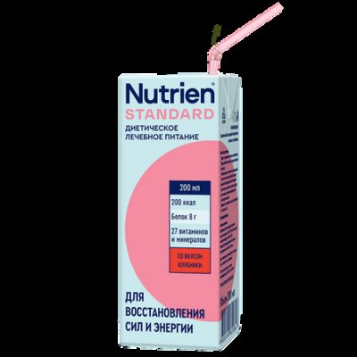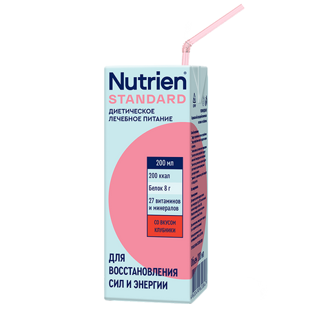полноценное диетическое лечебное (энтеральное) питание для людей, нуждающихся в нутритивной поддержке, которым необходим дополнительный источник питательных веществ, содержит легкоусвояемый белок и энергию для сохранения веса и сил пациентов в период лечения и реабилитации. Ключевые особенности: • Жиры состоят на 50% из среднецепочечных триглицеридов, что способствует быстрому усвоению энергии, даже в условиях ферментативной недостаточности (отсутствие или дефицит липазы). Присутствие в смеси среднецепочечных триглицеридов позволяет назначить ее в ранние сроки после операций, в том числе на желудочно-кишечном тракте, при ограниченном усвоении жиров у больных с нарушениями функции пищеварительной системы. • Белки представлены нативным молочным белком, который легко усваивается и обладает высокой биологической ценностью и биодоступностью. • Оптимальное соотношение ПНЖК (Омега 6, Омега 3 жирные кислоты), витаминно-минеральный комплекс обеспечивают выраженный антиоксидантный и иммуномодулирующий эффект. • Хорошая органолептика (не приторные, низкая вязкость) способствует высокой приверженности к диетотерапии. • Не содержит глютен, лактозу и холестерин в клинически значимых количествах. • Не содержит искусственных красителей и ароматизаторов. Форма выпуска: Жидкая готовая смесь объемом 200 мл в упаковке Tetra Pak со вкусом клубники. К упаковке прилагается одноразовая трубочка.