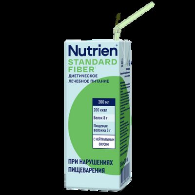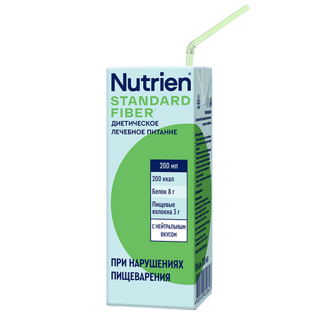 полноценное лечебное питание, готовое к употреблению для профилактики и устранения недостаточности питания, а также коррекции состава рациона питания. Композиция растворимых и нерастворимых пищевых волокон и пребиотиков нормализует процесс пищеварения, обладает пребиотическим и антиатерогенным действием. Ключевые особенности: • Жиры состоят на 50% из среднецепочечных триглицеридов, что способствует быстрому усвоению энергии, даже в условиях ферментативной недостаточности (отсутствие или дефицит липазы). Присутствие в смеси среднецепочечных триглицеридов позволяет назначить ее в ранние сроки после операций, в том числе на желудочно-кишечном тракте, при ограниченном усвоении жиров у больных с нарушениями функции пищеварительной системы. • Композиция растворимых и нерастворимых пищевых волокон и пребиотиков нормализует процесс пищеварения, обладает пребиотическим и антиатерогенным действием. • Низкий уровень сахаров обеспечивает низкий гликемический индекс, профилактирует повышение сахара в крови. • Белки представлены нативным молочным белком, который легко усваивается и обладает высокой биологической ценностью и биодоступностью. • Оптимальное соотношение ПНЖК (Омега 6, Омега 3 жирные кислоты), витаминно-минеральный комплекс обеспечивают выраженный антиоксидантный и иммуномодулирующий эффект. • Хорошая органолептика (не приторные, низкая вязкость) способствует высокой приверженности к диетотерапии. • Не содержит глютен, лактозу и холестерин в клинически значимых количествах. • Не содержит искусственных красителей и ароматизаторов. Форма выпуска Жидкая готовая смесь объемом 200 мл в упаковке Tetra Pak с нейтральным вкусом. К упаковке прилагается одноразовая трубочка.