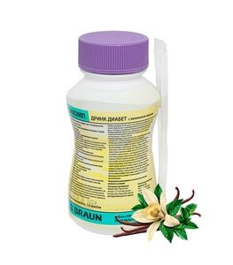 Нутрикомп Дринк Диабет — специализированный продукт для энтерального питания с подсластителями, ванильным вкусом. Полноценное сбалансированное питание с пищевыми волокнами. Не содержит генетически модифицированных продуктов. Не содержит глютен, лактозу. Продукт предназначен для энтерального питания при заболеваниях, связанных с недостаточностью питания или невозможностью самостоятельного приема пищи у пациентов с нарушением углеводного обмена, сахарным диабетам I и 2 типа и ожирением. Противопоказаниями к применению являются выраженная дисфункция желудочно-кишечного тракта в результате кишечной непроходимости, перфорации желудка и кишечника ишемии кишечника индивидуальная непереносимость какого-либо компонента смеси.Нутрикомп Дринк Диабет (Nutricomp Drink Diabetes/ Nutricomp Drink D) — специализированный продукт для энтерального питания с подсластителями, ванильным вкусом.Полноценное сбалансированное питание с пищевыми волокнами.Не содержит генетически модифицированных продуктов.Не содержит глютен, лактозу.Область применения: продукт предназначен для энтерального питания при заболеваниях, связанных с недостаточностью питания или невозможностью самостоятельного приема пищи у пациентов с нарушением углеводного обмена, сахарным диабетам I и 2 типа и ожирением.Калорическая плотность 1,0 ккал/млВ 100 мл смеси содержится 1,0 хлебной единицыОбщая калорийность на 200 мл составляет 206 ккал, из них доля:Белков 16 %Жиров 32 %Углеводов 52 %Осмолярность (мОсм/л) 220Осмоляльность (мОсм/кг) 265Не содержит глютена, лактозы (0,007 г /100 мл).Не содержит генетически модифицированных продуктов.Среднее содержание макронутриентов в 200 мл (бутылочка)Энергетическая ценность 206 ккал/ 864 кДжБелки, г 8,2Углеводы, из них 24 гсахара, из них 0,9 глактоза 0,014 гкрахмал 23 гЖиры, из них 7,0 гнасыщенные жирные кислоты, из них 1,0 гмононенасыщенные жирные кислоты 4,4 гполиненасыщенные жирные кислоты, из них 1,3 гомега-3-жирные кислоты, из них 0,6 гЭйкозапентаеновая кислота (ЭПК) 0,2 гДокозагексаеновая кислота (ДГК) 0,1 гПищевые волокна, г 4,2Среднее содержание микронутриентовВитамин А (ретинола ацетат) мкг РЭ 180Витамин D (холекальциферол) мкг 2Витамин Е (DL-альфа-токоферола ацетат) мг ТЭ 3Витамин К (филлохинон) мкг 14Витамин В1 (тиамина мононитрат)мг 0,40Витамин В2 (рибофлавин)мг 0,40Витамин В6 (пиридоксина гидрохлорид)мг 0,40Витамин В12 (цианокобаламин)мкг 0,60Витамин С (L-аскорбиновая кислота)мг 20Ниацин (никотинамид)мг НЭ 3,6Фолиевая кислота мкг 60Пантотеновая кислота (кальция-D-пантотенат)мг 1,2Биотин мкг 10Холин (холина хлорид)мг 60Бета-Каротин мг 0,20Натрий мг 200Калий мг 300Кальций мг 150Магний мг 40Фосфор мг 130Хлориды мг 200Железо мг 2,4Цинк мг 2,4Медь мкг 300Йод мкг 26Хром мкг 20Фтор мг 0,2Марганец мг 0,4Молибден мкг 20Селен мкг 14