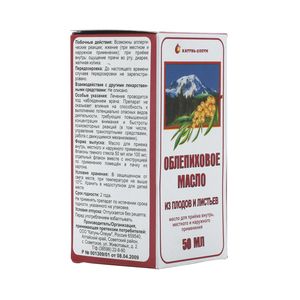 Показания к применениюДля приема внутрь и местного применения: лучевые поражения кожи и слизистых оболочек, кольпит, эндоцервицит, эрозия шейки матки, язвенная болезнь желудка и 12-перстной кишки, гиперацидный гастрит, период после операций на ЖКТ, атрофический фарингит, ларингит, хронический колит, неспецифический язвенный колит (в составе комбинированной терапии). Для наружного применения: скальпированные, послеоперационные, поверхностные ожоговые раны II-IIIa ст. (особенно при подготовке их к дерматопластике), ссадины, трофические язвы. Применение при беременности и кормлении грудьюИспользование облепихового масла во время беременности разрешено. Врачи рекомендуют будущим мамам держать в аптечках флакончик облепихового масла. Так как это лучшее безопасное лекарственное средство для беременной женщины, которое можно использовать на любом сроке беременности. Облепиховое масло рекомендовано к применению не только в период беременности, но и в послеродовой период.ПротивопоказанияПовышенная индивидуальная чувствительность к препарату. При применении внутрь: воспалительные процессы в желчном пузыре, печени, поджелудочной железе, при желчнокаменной болезни. Побочное действиеПобочное действия облепихового масла могут возникнуть в случае передозировки препарата, не правильного использования или аллергической реакции на компоненты масла. Самые распространенные побочное действия облепихового масла: Ощущение жжения, Покраснения, Зуд, При внутреннем использовании – диарея, горечь во рту, Аллергические реакции. СоставОблепиховое масло содержит: Отжатые, сухие плоды облепихи и листья облепихи крушиновидной — 150 г. Подсолнечное масло — достаточное количество для получения 100 г масла. Во флаконе 50 мл масла.Взаимодействие с другими препаратамиВзаимодействие облепихового масла с другими препаратами досконально не изучено. Но на сегодняшний день еще не зафиксировано случаев патологического воздействия препарата на человеческий организм из-за взаимодействия с другими препаратами.