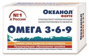 БАД. Не является лекарственным средствомОкеанол форте 3-6-9 — биокомплекс нового поколения, является дополнительным источником полиненасыщенных жирных кислот (ПНЖК) Омега 3, 6, 9, получаемых из подкожного жира особых пород рыб, обитающих в холодных водах Северного Ледовитого океана.Высокое содержание Омега 3 достигается фильтрованием жира при пониженном температурном режиме с использованием фильтропресса. Для предотвращения процессов окисления в состав введен витамин Е (0,1% от массы).Семейство полиненасыщенных жирных кислот (ПНЖК), необходимых для нормального функционирования органов и систем. ПНЖК Омега 3, 6, 9 относятся к незаменимым жирным кислотам, так как не синтезируются в организме человека и должны поступать в достаточном количестве извне. Применение современных специальных технологий позволяет получать максимальное количество Омега 3, 6, 9. Омега3 являются структурными компонентами клеточных мембран, в первую очередь, клеток крови, сердца, мозга, кровеносных сосудов. Они регулируют их микровязкость, проницаемость, электрические свойства, возбудимость.И именно от этих изменений свойств мембран зависят различные процессы жизнедеятельности организма: передача сигналов между нервными клетками, активность работы мозга, состояние фоторецепторной функции сетчатки глаза и многие другие. Омега 3 являются строительным материалом для образующихся из них важнейших биорегуляторов эйкозаноидов (простагландинов, простациклинов, тромбоксанов, лейкотриенов).Эйкозаноиды обладают чрезвычайно широким спектром действия: влияют на процессы тромбообразования (разжижают кровь и не дают образоваться тромбам), блокируют воспалительные процессы, поддерживают тонус кровеносных сосудов и бронхов, нормализуют кровяное давление, повышают иммунный статус, подавляют аллергические состояния, регулируют процессы секреции, улучшают состав и состояние слизистых, ускоряют заживление.Омега 3 являются защитниками организма в борьбе с преждевременным старением, болезнями сердца, артритом, аллергиями, астмой, аутоиммунными заболеваниями. Они активно борются со свободными радикалами нестабильными фрагментами молекул, разрушающими генетический аппарат клеток. Действие Омега 6 на организм тесно взаимосвязано с Омега 3, так как незаменимые жирные Омега кислоты положительно воздействуют на организм в определенном соотношении. Омега 6 подразделяется на две большие группы: линолевые и гаммалинолевые жирные кислоты.Эти полезные и необходимые организму кислоты содержатся в растительных маслах (оливковое, подсолнечное и др.). Благодаря употреблению Омега 6, в организме создается оптимальный баланс гормонов посредников (простагландинов). Они необходимы для улучшения состояния кожи, снимают воспаления, ослабляют боли, необходимы для энергичности, являются катализаторами жизненных сил организма, а также отвечают за красоту кожи, волос и ногтей.Также, клинически было доказано, что употребление Омега 6 эффективно при лечении рассеянного склероза на любой стадии заболевания. Однако максимальная эффективность отмечена только при одновременном приеме Омеги 3 и 6. Омега 9 принадлежит к группе полиненасыщенных жирных кислот, которые входят в состав каждой клетки организма человека, участвуют в обменных процессах. Кроме того, они влияют на синтез 