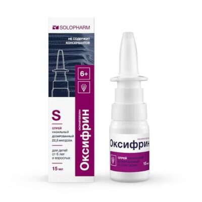 Показания При местном применении оксиметазолин не оказывает системного действия. T1/2 оксиметазолина при его интраназальном введении составляет 35 ч. 2.1% оксиметазолина выводится с мочой и около 1.1% с калом. Фармакологическое действие Оксиметазолин оказывает сосудосуживающее действие. При местном нанесении на воспаленную слизистую оболочку полости носа уменьшает ее отечность и выделения из носа. Восстанавливает носовое дыхание. Устранение отека слизистой оболочки полости носа способствует восстановлению аэрации придаточных пазух полости носа, полости среднего уха, что уменьшает вероятность возникновения бактериальных осложнений (гайморита, синусита, среднего отита). При местном интраназальном применении в терапевтических концентрациях не раздражает и не вызывает гиперемию слизистой оболочки полости носа. Препарат Оксифрин, спрей назальный дозированный 11.25 мкг/доза начинает действовать быстро, в течение нескольких минут. Препарат Оксифрин, спрей назальный дозированный 22.5 мкг/доза действует с 25 секунды. Продолжительность действия препаратов до 12 ч. Результаты двойного слепого плацебо-контролируемого исследования у пациентов с острым вирусным ринитом в возрасте 12-70 лет показали, что применение препарата в концентрации 22.5 мкг/доза сокращает медиану продолжительности насморка с 6 до 4 дней. Лекарственное взаимодействие Замедляет всасывание местноанестезирующих препаратов, удлиняет их действие. При одновременном применении с ингибиторами МАО (в течение предшествующих 2 недель и в течение 2 недель после их отмены), трициклическими антидепрессантами или другими препаратами, способствующими повышению АД, может наблюдаться повышение АД. Совместное назначение других сосудосуживающих препаратов повышает риск развития побочных эффектов.