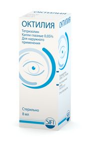 Показания к применениюВ составе комплексной терапии при лечении заболеваний глаз, сопровождающихся симптомами раздражения, вызванных аллергическими, химическими и физическими факторами (дым, пыль, сильное освещение, отражение света от снежных и водных поверхностей, от излучающих экранов мониторов).Применение при беременности и кормлении грудьюС осторожностью следует назначать препарат Октилия при беременности и в период лактации (грудного вскармливания).Противопоказания- глаукома;- синдром сухого глаза;- эпителиально-эндотелиальные дистрофии роговицы;- детский возраст до 3 лет;- повышенная индивидуальная чувствительность к компонентам препарата.Побочное действиеМестные реакции: мидриаз, повышение внутриглазного давления, чувство жжения, реактивная конъюнктивальная гиперемия.Системные реакции: головная боль, тошнота, сонливость, слабость, тремор, головокружение, бессонница, сердцебиение, тахикардия, гипергликемия, повышение АД, нарушение деятельности сердца, аллергические реакции.СоставНа 1 мл: тетризолина гидрохлорид 500 мкг. Вспомогательные вещества: натрия гидрофосфата додекагидрат, калия дигидрофосфат, натрия хлорид, динатрия эдетат, полисорбат 80, бензалкония хлорид, вода ромашковая, вода липовая, вода очищенная.Взаимодействие с другими препаратамиЛекарственное взаимодействие препарата Октилия не описано.