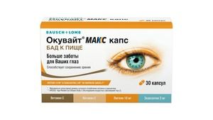 Окувайт® Макс — еще больше заботы для Ваших глаз!В ходе нашей жизни организм подвергается постоянному стрессу. Факторы окружающей среды, частое взаимодействие с компьютером, разрушающее воздействие солнечного света, возраст могут приводить к естественному процессу дегенерации (разрушения) сетчатки, что может провоцировать ухудшение зрения.Возрастные изменения в сетчатке могут носить необратимый характер и приводить к частичной или даже полной потере зрения. Поэтому профилактике старения сетчатки глаз отводится большое значение.При таких состояниях как миопия, сетчатка также нуждается в дополнительном питании, так как при ней происходит удлинение глазного яблока, перерастяжение сетчатки, что может приводить к нарушению питания и нормального функционирования глазного дна. Для поддержания нормального функционирования органа зрения при миопии также важно принимать полезные для глаз витамины и микроэлементы.Содержание в 1 стике:Витамин С 180 мгВитамин Е 30 мгЦинк 15 мгЛютеин 10 мгЗеаксантин 2 мгДокозагексаеновая кислота (ДГК) 150 мгДля сохранения здорового зрения важны: здоровый образ жизни, периодический отдых, специальные упражнения для глаз, защита глаз от прямого солнечного света, а также регулярный мониторинг зрения, начиная с 50 лет.Как «Окувайт® Макс» может помочь сохранению здоровья Ваших глаз?Биологически активная добавка к пище «Окувайт® Макс» была специально разработана для сохранения здоровья Ваших глаз. «Окувайт® Mакс» — это источник каротиноидов (лютеина, зеаксантина), докозагексаеновой кислоты (ДГК) и дополнительный источник витаминов С, Е и цинкаКомпоненты «Окувайт® Макс» не вырабатываются организмом и рекомендованы для включения в ежедневный рацион питания. Содержащиеся в составе продукта каротиноиды способствуют защите сетчатки от разрушающего воздействия яркого света, снижают риск возникновения и развития возрастных дегенеративных изменений сетчатки и обладают антиоксидантными свойствами.Лютеин — каротиноид, который служит естественной защитой сетчатки от слишком яркого света.Зеаксантин — желтый пигмент из группы ксантофиллов, накапливается в пигменте сетчатки глаза человека, играет роль защитного механизма от индуцируемого светом повреждения клеток, способствует разрушению липофусцина. Клинические исследования показали, что длительный прием лютеина и зеаксантина повышает плотность макулярного пигмента и способствует поддержанию высокой остроты зрения.Витамины С и Е, цинк, входящие в состав биологически активной добавки к пище «Окувайт® Макс», являясь естественными антиоксидантами, помогают снизить воздействие вредных факторов и сохранить зрение, способствуют укреплению кровеносных сосудов, в том числе сосудов глазного дна.Витамин С — один из главных, необходимых человеку антиоксидантов. Участвует в регулировании окислительно-восстановительных процессов, углеводного обмена, свертываемости крови, регулирует восстановление зрительных пигментов, уменьшает повышенное внутриглазное давление, снижает риск развития глаукомы.Витамин Е — выполняет роль биологического антиоксиданта, инактивирующего свободные радикалы и тем самым препятствующего их образованию. Препятствует повышенной ломкости и проницаемости капилляров. Является профилактикой появления и развития ката