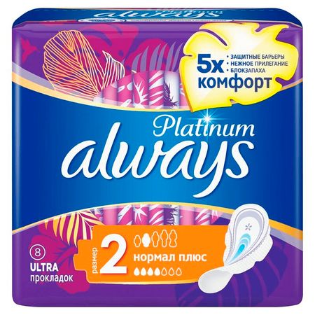 Бренд Always — является одним из мировых лидеров в производстве и продаже средств женской гигиены.ALWAYS PLATINUM ULTRA NORMAL PLUS ЖЕНСКИЕ ГИГИЕНИЧЕСКИЕ ПРОКЛАДКИ — нейтрализуют запах.Впитываемость: 4 капли (из 7)Размер: 2Гигиенические прокладки Always Platinum с крылышками — лучшие прокладки в линейке Always Ultra для комфорта и защиты благодаря уникальному двойному верхнему слою с микроподушечками. 1000 микроподушечек обеспечивают бoльшую мягкость и комфорт (по сравнению с Always Ultra).Идеально подходят при незначительных выделениях и размере нижнего белья S и M или при умеренных выделениях и размере белья S.Always Platinum Нормал Плюс (Размер 2) с крылышками рекомендованы для дневного использования при скудных и умеренных выделениях.Прокладки Always Platinum обеспечивают более эффективную защиту (по сравнению с Always Ultra) благодаря активно впитывающим боковым барьерам, защищающим от протеканий, и улучшенному внутреннему слою с более эффективным абсорбирующим материалом (по сравнению с Always Ultra), который впитывает и удерживает жидкость внутри прокладки, обеспечивая ощущение сухости.Гигиенические прокладки ALWAYS Platinum нормал плюс (размер 2) одновременно обеспечивают большую мягкость и экстразащиту (по сравнению с ALWAYS Ultra). Благодаря 1000 мягких микроподушечек, действующих как боковые барьерчики, и внутреннему слою повышенной впитываемости ALWAYS Platinum — номер 1 для защиты и мягкости от ALWAYS. Технология нейтрализации запаха устраняет, а не маскирует запахи. Кроме того, ALWAYS Platinum всего 3 мм толщиной обеспечивают великолепную защиту и мягкость.