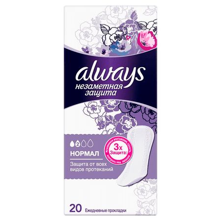 Ежедневные гигиенические прокладки Always Незаметная Защита созданы для тех моментов, когда вам необходима дополнительная защита. Их технология нейтрализации запаха дарит непревзойденную свежесть и обеспечивает чувство уверенности. Ежедневные гигиенические прокладки Always Незаметная Защита — отличное средство защиты при всех видах выделений. Преимущества: *Защита при всех видах выделений; *Тройная защита: мгновенно впитывают, сохраняют сухость, нейтрализуют неприятные запахи; *Надежная защита, которую практически не чувствуешь; *Мгновенно впитывают влагу; *Технология нейтрализации запаха; *Незаметны под одеждой; *С легким ароматом; *Проверено дерматологами.