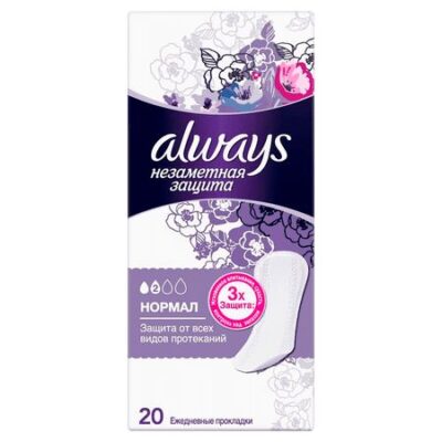 Ежедневные гигиенические прокладки Always Незаметная Защита созданы для тех моментов, когда вам необходима дополнительная защита. Их технология нейтрализации запаха дарит непревзойденную свежесть и обеспечивает чувство уверенности. Ежедневные гигиенические прокладки Always Незаметная Защита — отличное средство защиты при всех видах выделений. Преимущества: *Защита при всех видах выделений; *Тройная защита: мгновенно впитывают, сохраняют сухость, нейтрализуют неприятные запахи; *Надежная защита, которую практически не чувствуешь; *Мгновенно впитывают влагу; *Технология нейтрализации запаха; *Незаметны под одеждой; *С легким ароматом; *Проверено дерматологами.