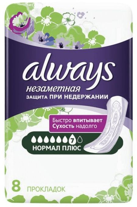 Прокладки Always Незаметная защита при недержании Нормал Плюс, 8 шт. Для тех моментов, когда вам необходима дополнительная защита, есть прокладки Always «Незаметная защита при недержании». Они впитывают в 3 раза больше жидкости, чем обычные ежедневные прокладки*, и надолго сохраняют сухость. Кроме того, они оснащены технологией нейтрализации запаха, которая дарит непревзойденную свежесть и обеспечивает чувство уверенности. Попробуйте прокладки Always «Незаметная защита» для защиты при недержании. *по сравнению с самыми популярными ежедневными прокладками в России –Быстро впитывает. Сухость надолго — ультравпитывающий внутренний слой превращает жидкость в гель и удерживает его внутри –Эксклюзивная технология нейтрализации запаха –Удерживается на месте, обеспечивая комфорт –Защитные барьеры LeakGuards –Проверено дерматологами –С легким ароматом –Прокладки Always «Незаметная защита при недержании» Нормал Плюс подходят при обильных и частых выделениях –Проверено дерматологам
