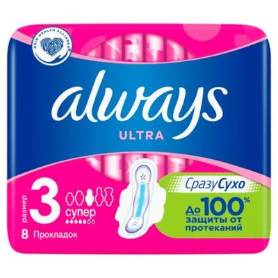 Гигиенические прокладки Always Ultra Супер (Размер 3) с системой СразуСухо мгновенно впитывают влагу и удерживают ее внутри, обеспечивая до 100 % защиты и уверенности. Гигиенические прокладки Always Ultra оснащены технологией нейтрализации запаха, которая блокирует неприятный запах, а не просто маскирует его. Гигиенические прокладки Always Ultra толщиной всего 3 мм дарят комфорт и обеспечивают непревзойденную защиту во время менструации.