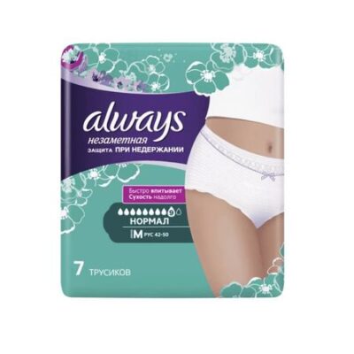 Нижнее белье Always «Незаметная защита при недержании» Нормал, 9 Капель М, 7 шт. Для тех моментов, когда вам необходима дополнительная защита, есть нижнее белье Always «Незаметная защита при недержании». Нижнее белье Always «Незаметная защита при недержании» Нормал 9 Капель М защитит вас даже при сильном недержании, вызванном внезапными позывами мочевого пузыря и всегда останется на месте. Ультравпитывающее нижнее белье оснащено технологией RapidDry, которая в считанные секунды запирает жидкость и неприятные запахи. Двойные защитные барьеры LeakGuards помогают предотвратить протекания там, где они случаются чаще всего. Благодаря форме 360° FormFit белье комфортно сидит, обеспечивая незаметную, но эффективную защиту и ощущение спокойствия в течение дня. Нижнее белье Always «Незаметная защита при недержании» подходит даже при сильном недержании. Белье Always «Незаметная защита при недержании» нужно использовать вместо вашего обычного нижнего белья в случае, если у вас частые внезапные позывы мочевого пузыря . Рекомендовано использовать белье в те моменты, когда вы ведете активный образ жизни или когда вы ищете надежную защиту от протеканий при недержании, которая всегда остается на месте. — Быстро впитывает. Сухость надолго — ультравпитывающий внутренний слой превращает жидкость в гель и удерживает его внутри- Двойные защитные барьеры LeakGuards помогают предотвратить протекания- Тонкий трехслойный центр. Впитывает и запирает влагу и неприятные запахи- Дизайн с учетом особенностей женского тела. Мягкий и комфортный как хлопок материал- Эксклюзивная технология нейтрализации запаха- Благодаря дизайну 360° FormFit и рельефному центру белье повторяет форму вашего тела, обеспечивая комфортную посадку- Трусики низкой посадки- Проверено дерматологами