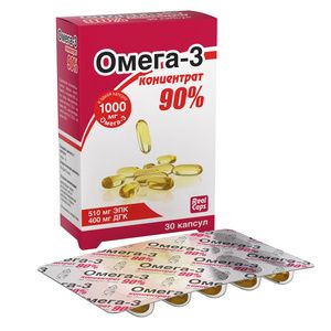 Омега-3 концентрат 90% капсулы по. 1500 мгСырьё получено из рыб с коротким жизненным циклом (анчоусы) и производится с применением современных высокотехнологичных методов очистки, включающих 3 стадии молекулярной дистилляции и карбоновую фильтрацию. Для предотвращения процесса окисления жирных кислот в концентрат добавлена смесь токоферолов (натуральный витамин Е).Содержание компонентов БАД в рекомендуемой суточной норме потребления (1 капсула):ПНЖК Омега-3 — 1000 мг — 50% от адекватного уровня потребленияЭйкозапентаеновая кислота — 510 мг — 85% от адекватного уровня потребленияДокозагексаеновая кислота — 400 мг — 57,1% от адекватного уровня потребления* согласно «Единым санитарно-эпидемиологическим и гигиеническим требованиям к товарам, подлежащим санитарно-эпидемиологическому надзору (контролю)» (Приложение 5).Пищевая и энергетическая ценность 1 капсулы массой 1500 мг: белки 0,3 г, жиры 1 г, 46 кДж/10 ккал.Описание компонентов:Полиненасыщенные кислоты Омега-3 (ПНЖК Омега-3) — необходимый элемент в образовании клеточных мембран тканей всего организма. Омега-3 — это группа полиненасыщенных жирных кислот, важнейшими из которых являются докозагексаеновая кислота (ДГК), эйкозапентаеновая кислота (ЭПК) и альфа-линоленовая кислота (АЛК), относящиеся к незаменимым (эссенциальным) веществам. Незаменимые вещества необходимы для нормальной жизнедеятельности человека, но не синтезируются организмом или синтезируются в недостаточном количестве. Основным источником ДГК и ЭПК является рыбий жир, тогда как АЛК содержится преимущественно в растительных маслах. Потребность организма человека в ДГК и ЭПК намного выше, чем в АЛК, поэтому ДГК и ЭПК считаются основными веществами группы Омега-3 необходимыми человеку.ПНЖК Омега-3 полезны при: Повышенном риске развития сердечно-сосудистых заболеваний Высоком холестерине Профилактике простудных заболеваний Хронических воспалительных процессах Повышенной физической и нервно-психической нагрузке, стрессах Беременности и кормлении грудью Сезонных депрессиях Ломкости волос и сухости кожи В период восстановления после перенесенных заболеваний При несбалансированном и неполноценном питании и в период соблюдения диет