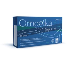 OMEGIKA 500 мг Омега-3 + Витамин K2 — особая комбинация для поддержания красоты и молодости, а также жизненно важных функций организма: здоровья сосудов и сердца.Развитие сердечно-сосудистых патологий (в том числе тромбообразование, повышение уровня холестерина, триглицеридов); ухудшение состояния кожи, волос, ногтей; снижение остроты зрения, концентрации внимания; нарушение памяти; общая утомляемость и ослабление иммунитета — все эти и многие другие проблемы могут свидетельствовать о недостатке полиненасыщенных жирных кислот (ПНЖК) Омега-3. Наиболее дефицитные из них — эйкозапентаеновая кислота (ЭПК) и докозагексаеновая кислота (ДГК).ЭПК, ДГК и Витамин К2 играют незаменимую роль в поддержании обмена веществ, улучшении общего состояния здоровья и снижении рисков и тяжести многих заболеваний.Преимущества OMEGIKA: Качество, которое видно Кристально чистый концентрат Омега-3 (цветность по шкале Гарднера менее 1.5) из рыб тихоокеанского происхождения, изготовленный по стандартам GMP в непосредственной близости от мест вылова. Комбинация Омега-3 + Витамин K2 произведена в Европейском Союзе. Оптимальная дозировка, рекомендованная ВОЗ и GOED Суточная доза ЭПК + ДГК в составе OMEGIKA соответствует рекомендациям ВОЗ (Всемирной организации здравоохранения) и GOED (Глобальной организации по ЭПК и ДГК Омега-3 кислот). Подходит и для здоровой популяции (1 капсула в сутки), и для популяции с наличием значимых патологий, в том числе сосудов и сердца (2 капсулы в сутки). Удобный приём Капсулы небольшого размера с лимонным запахом и вкусом.Синергия компонентов в составе OMEGIKAОмега-3 кислоты поддерживают: состояние ногтей и кожи, ее барьерную функцию; здоровый блеск, текстуру волос и их устойчивость к выпадению; работу сердечно-сосудистой и эндокринной системы; иммунитет; нормальную работу головного мозга; здоровье глаз.Помогают: ускорять обмен веществ; снижать течение хронического воспаления, в том числе в суставах; контролировать уровень холестерина, триглицеридов, артериального давления.Витамин K2 поддерживает: упругость кожи, препятствуя кальцификации эластина; эластичность артерий, регулируя обмен кальция; энергетический обмен в клетках; плотность костей, что особенно важно в период менопаузы; когнитивные функции, снижая нейровоспаление и нейродегенерацию.Помогает: улучшать проходимость сосудов; снижать риски отложения соединений кальция на стенках сосудов, в почках, хряще.