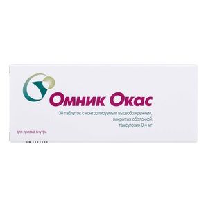 Показания к применениюДоброкачественная гиперплазия предстательной железы (лечение дизурических расстройств).Применение при беременности и кормлении грудьюПротивопоказано.ПротивопоказанияГиперчувствительность к тамсулозину или любому другому компоненту препарата;ортостатическая гипотензия; выраженная печеночная недостаточность.Побочное действиеРедко — головокружение, ретроградная эякуляция; в единичных случаях — ортостатическая гипотензия, тахикардия/сердцебиение, астения, головная боль. Со стороны ЖКТ: редко — тошнота, рвота, диарея, запор. В крайне редких случаях могут наблюдаться реакции гиперчувствительности (кожная сыпь, зуд, ангионевротический отек).СоставМирабегрон 50 мг в таблетке. Вспомогательные вещества: макрогол 2 000 000 — 70 мг, макрогол 8000 — 119.6 мг, гипролоза — 7.5 мг, бутилгидрокситолуол — 0.4 мг, магния стеарат — 2.5 мг. Состав пленочной оболочки: опадрай 03F42192 (гипромеллоза 2910 6 мПа·сек — 69.536%, макрогол 8000 — 13.024%, краситель железа оксид желтый — 17.44%) — 7.5 мг.Взаимодействие с другими препаратамиПри назначении тамсулозина вместе с атенололом, эналаприлом, нифедипином или теофиллином взаимодействий обнаружено не было. При одновременном применении с циметидином отмечено некоторое повышение концентрации тамсулозина в плазме крови; с фуросемидом — снижение, однако это не требует изменения дозы препарата Омник Окас, поскольку концентрация препарата остается в пределах нормального диапазона. Диазепам, пропранолол, трихлорметиазид, хлормадинон, амитриптилин, диклофенак, глибенкламид, симвастатин и варфарин не изменяют свободную фракцию тамсулозина в плазме человека in vitro. В свою очередь, тамсулозин также не изменяет свободные фракции диазепама, пропранолола, трихлорметиазида и хлормадинона. В исследованиях in vitro не было обнаружено взаимодействия на уровне печеночного метаболизма с амитриптилином, сальбутамолом, глибенкламидом и финастеридом. Диклофенак и варфарин могут увеличивать скорость выведения тамсулозина. Одновременное назначение других блокаторов α1-адренорецепторов может привести к гипотензивному эффекту.