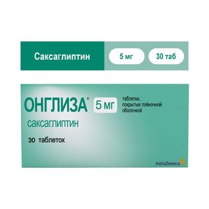 Показания к применениюСахарный диабет 2 типа в дополнение к диете и физическим упражнениям для улучшения гликемического контроля в качестве: монотерапии. Стартовой комбинированной терапии с метформином. Добавления к монотерапии метформином, тиазолидиндионами, производными сульфониломочевины, при отсутствии адекватного гликемического контроля на данной терапии.Применение при беременности и кормлении грудьюВ связи с тем, что применение саксаглиптина при беременности не изучено, не следует назначать препарат в этот период. Неизвестно, проникает ли саксаглиптин в грудное молоко. В связи с тем, что не исключена возможность проникновения саксаглиптина в грудное молоко, следует прекратить грудное вскармливание на период лечения саксаглиптином или отменить терапию, учитывая соотношение риска для ребенка и пользы для матери.ПротивопоказанияПовышенная индивидуальная чувствительность к любому компоненту препарата. Сахарный диабет 1 типа (применение не изучено). Применение совместно с инсулином (не изучено). Диабетический кетоацидоз. Врожденные непереносимость галактозы, лактазная недостаточность и глюкозо-галактозная мальабсорбция. Беременность, лактация. Возраст до 18 лет (безопасность и эффективность не изучены).Побочное действиеОбщая частота нежелательных явлений при приеме препарата Онглиза 5 мг в режиме монотерапии и в режиме добавления к терапии метформином, тиазолидиндионом или глибенкламидом была сопоставима с таковой в группе плацебо. Шкала частоты побочных реакций: очень часто (≥110). часто (≥1100, меньше110). нечасто (≥11000, меньше1100). редко (≥110 000, меньше11000). очень редко (меньше110 000). В таблице приведены побочные эффекты, выявленные у пациентов с сахарным диабетом 2 типа при приеме препарата Онглиза в дозе 5 мг в ходе клинических исследований. Побочные эффекты представлены по данным объединенного анализа пяти плацебо-контролируемых клинических исследований препарата Онглиза. Инфекции верхних отделов дыхательных путей: Часто. Инфекции мочевыводящих путей: Часто. Гастроэнтерит: Часто. Синусит : Часто. Рвота: Часто. Головная боль: Часто. Частота реакций гиперчувствительности, отмеченных к 24 неделе терапии, составила 1. 5% у пациентов, получавших препарат Онглиза 5 мг, и 0. 4% у пациентов, получавших плацебо. Реакции гиперчувствительности, возникшие у пациентов, принимавших препарат Онглиза, не требовали госпитализации и были расценены лечащими врачами как не представлявшие угрозу жизни.СоставДействующее вещество: Саксаглиптин (Saxagliptin). Концентрация действующего вещества (мг): 5
