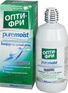 Раствор для линз Опти-Фри Puremoist.Увлажняющая матрица HydraGlyde является запатентованным многофункциональным блок-сополимером, разработанным для увлажнения и смазывания силикон-гидрогелевых контактных линз.Раствор многофункциональный для очистки, дезинфекции и хранения контактных линз Опти-Фри PureMoist с контейнером для хранения контактных линз предназначен для ежедневной очистки, удаления белковых и сокращения липидных отложений, промывания, увлажнения, химической (не тепловой) дезинфекции и хранения всех типов мягких контактных линз, включая силикон-гидрогелевые, в соответствии срекомендациями офтальмолога.Результат: Раствор многофункциональный для очистки, дезинфекции и хранения контактных линз Опти-Фри PureMoist: Обеспечивает длительное 16-часовое увлажнение, сохраняя комфорт в течение всего дня. Увлажняющая матрица HydraGlyde работает независимо от вашей слезной пленки, сохраняя влагу и обеспечивая комфортное ношение контактных линз с момента надевания до снятия. Сохраняет защитный слой влаги между линзой и глазом, позволяющий вашему веку скользить по поверхности линзы, не вызывая раздражения. Сохраняет линзу увлажненной в течение дня. Связывается с сухими участками линз, предотвращая образование липидных отложений. Сокращает количество липидных отложений и удаляет белковые отложения, сохраняя свежесть и чистоту линз