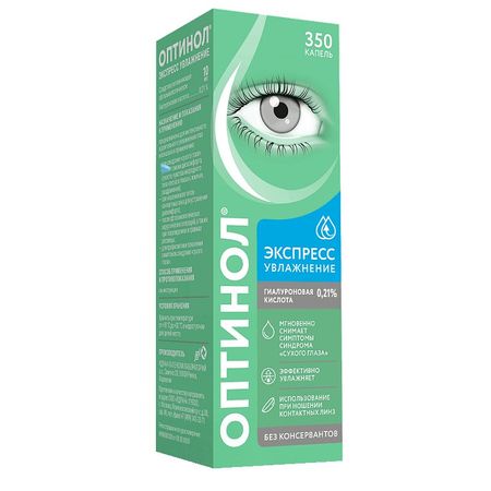 Средство увлажняющее офтальмологическое Оптинол® Экспресс Увлажнение представляет собой изотонический (pH 6.0-7.5) буферизированный стерильный раствор, содержащий в своем составе гиалуроновую кислоту в виде натрия гиалуроната, которая является природным увлажняющим веществом с высокой способностью связываться с водой. В составе средства Оптинол® Экспресс Увлажнение используется натрия гиалуронат, который имеет меньший молекулярный размер по сравнению с гиалуроновой кислотой, что позволяет веществу легче проникать в ткани и обеспечивать образование равномерного, стабильного и устойчивого защитного слоя на роговице глаза, не влияя на остроту зрения.Гиалуроновая кислота (в виде натриевой соли) обладает необходимой вязкостью и адгезивными свойствами по отношению к роговице глаза. За счет этих свойств гиалуроновой кислоты при закапывании средства Оптинол® Экспресс Увлажнение на передней поверхности роговой оболочки глаза образуется тонкая пленка, предохраняющая глаз от пересыхания, снимая ощущение дискомфорта, сухости, усталости, рези и раздражение глаз. Оптинол® Экспресс Увлажнение эффективно увлажняет, возвращает здоровое состояние поверхности глаз — роговицы и конъюнктивы. Средство увлажняющее офтальмологическое Оптинол® Экспресс Увлажнение предназначено для снятия симптомов синдрома сухого глаза в течение дня. Действие защитной пленки начинается мгновенно. Длительность эффекта при применении раствора Оптинол® Экспресс Увлажнение составляет около 2-3 ч. При этом защитная пленка постепенно вымывается при моргании вместе со слезной жидкостью и рекомендуется повторное закапывание.При ношении всех типов контактных линз Оптинол® Экспресс Увлажнение можно закапывать в конъюнктивальный мешок без удаления линз.Отсутствие консервантов и наличие природного увлажняющего вещества (гиалуроновой кислоты в виде натриевой соли) обеспечивает хорошую переносимость средства Оптинол® Экспресс Увлажнение даже при длительном применении. Благодаря специально разработанному механизму флакона раствор остается стерильным в течение 180 дней (6 месяцев) после первого применения, при этом не содержит консервантов. Мультидозатор флакона обеспечивает точность дозирования и удобство применения средства Оптинол® Экспресс Увлажнение. Флакон содержит 350 капель.