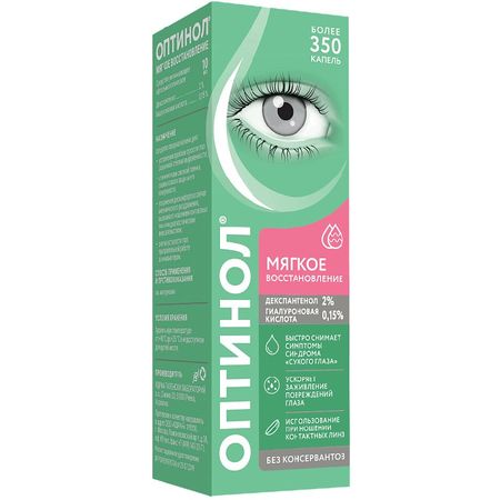 Средство увлажняющее офтальмологическое «Оптинол®» Мягкое восстановление предназначено для интенсивного и длительного увлажнения глаз и показано к применению: — после офтальмологических хирургических операций, а также при повреждениях и травмах роговицы; — при ношении всех типов контактных линз для устранения дискомфорта; — при синдроме «сухого глаза» (с симптомами дискомфорта, сухости, чувства инородного тела «песка в глазах», жжения, раздражения); — для снятия усталости глаз при интенсивной зрительной нагрузке. *Ускоряет заживление повреждений глаза после травм и хирургических операций *Быстро снимает симптомы синдрома сухого глаза *Можно закапывать в конъюнктивальный мешок без снятия линз *Рекомендуется использовать с ночными корректирующими линзами *Без консервантов *Благодаря серебряной пружине, которая сохраняет стерильность содержимого флакона при закапывании капель, средство можно использовать в течение 6 месяцев после вскрытия *Флакон с мультидозатором обеспечивает точное дозирование/350 капель во флаконе