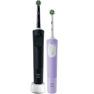 Набор из двух щеток нового поколения Oral-B Vitality PRO обеспечит ощущение профессиональной чистки каждый день и подойдет даже для любителей экстра бережного очищения благодаря уникальному режиму SENSITIVE PLUS. Oral-B Vitality PRO удаляет до 100% больше налета по сравнению с обычной зубной щеткой, а встроенный таймер оповестит вас о завершении 2-х минутной процедуры чистки. В наборе щетки двух цветов: черная и лиловая. Сделайте выбор в пользу Oral-B — марки зубных щеток № 1, используемой большинством стоматологов в мире*. Особенности модели: • ВОЗВРАТНО-ВРАЩАТЕЛЬНАЯ ТЕХНОЛОГИЯ ЧИСТКИ 2D ОТ ORAL-B: щётка вибрирует и крутится, удаляя до 100% больше налета по сравнению с обычной щёткой; • 3 РЕЖИМА ЧИСТКИ: ежедневная чистка, бережная чистка и уникальный режим SENSITIVE PLUS для невероятно бережной чистки; • ТАЙМЕР с функцией оповещения о необходимости смены зоны чистки зубов; • ЗАРЯЖАЕМЫЙ АККУМУЛЯТОР для длительной автономной работы щетки. В комплекте: 2 сменные насадки Oral-B Cross Action с щетинками, меняющими цвет от зеленого до желтого, подсказывая, когда их пора заменить, 1 зарядное устройство, гарантийный талон и инструкция. *На основании международных опросов P&G, проводимых среди репрезентативной выборки стоматологов регулярно. **Фирменная гарантия будет аннулирована в случае повреждения рукоятки в результате использования неоригинальных насадок. Oral-B не рекомендует использовать сменные насадки других производителей.