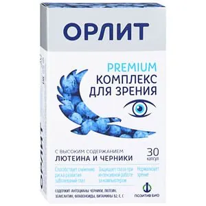 Биологически активная добавка к пище. Не является лекарственным средством.БАД ОРЛИТ — Premium комплекс для защиты и нормализации зрительной функции.Способствует снижению риска заболеваний глазЗащищает глаза при интенсивной работе за компьютеромНормализует зрениеГлаза любого человека постоянно находятся в напряжении: длительное использование компьютера, планшета, смартфона, чтение при недостаточном освещении, в транспорте, вредоносное воздействие синей части спектра света.Все эти аспекты повседневной жизни разрушительно действуют на орган зрения. Кроме того, возрастные изменения организма также сказываются на здоровье глаз и качестве зрения. Поэтому наши глаза нуждаются в постоянной заботе и поддержке.Важнейшими элементами питания для глаз являются:Лютеин и зеаксантин — природные пигменты, защищающие сетчатку от агрессивной части спектра света, способствующие увеличению остроты зрения, а также снижающие его возрастные изменения.Они также являются прекрасными помощниками в профилактике катаракты – помутнения хрусталика.Антоцианы — мощные антиоксиданты, которые участвуют в восстановлении светочувствительного пигмента родопсина и, таким образом, улучшают адаптацию к различным уровням освещенности, усиливая остроту зрения в сумерках, улучшают питание сетчатки глаза и восстанавливают механизмы ее защиты.Экстракт Гинкго Билоба обладает антиоксидантной активностью, благотворно действует на микроциркуляцию, укрепляет стенки сосудов, предотвращает хрупкость капилляров.Проантоцианидины также являются мощными антиоксидантами, которые улучшают эластичность сосудов, остроту зрения и контрастность восприятия изображения, способствуют нормализации внутриглазного давления, профилактике и замедлению прогрессирования глаукомы.Бета-каротин — служит предшественником витамина А (ретинол), который принимает участие в синтезе родопсина – основного зрительного пигмента.Цинк – способствует обострению зрения, обеспечивает прозрачность хрусталика, поддерживает структуру зрительного нерва.Витамин С – способствует повышению эффективности действия антиоксидантов (лютеин, зеаксантин, антоцианы), что ускоряет восстановление зрительных пигментов в сетчатке.Витамин Е — ускоряет регенерацию поврежденных клеток, участвует в тканевом дыхании и других важнейших процессах метаболизма.Витамин В2 — улучшает состояние органа зрения, принимая, наряду с витамином A, участие в процессах темновой адаптации, снижает усталость глаз и играет большую роль в предотвращении катаракты.Комплекс перечисленных биологически активных веществ необходим:при синдроме компьютерного зрения, выражающегося в усталости, покраснении глаз, слезотечении, двоении изображения,при снижении сумеречного зрения, так называемой «куриной слепоте»,для профилактики заболеваний глаз.Орлит – биологически активная добавка к пище, источник антоцианов, проантоцианидинов, флавоноидов, дополнительного источника цинка, бета-каротина, лютеина, зеаксантина и витаминов (В2, Е, С).Не является лекарством.
