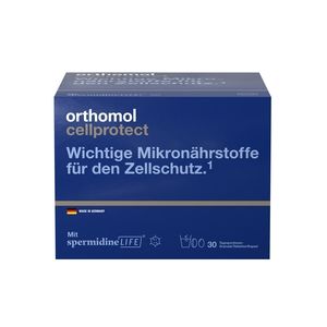 Orthomol Cellprotect – это витаминно-минеральный комплекс, который способствует защите и восстановлению клеток организма и предотвращает процессы старения.Препарат защищает клетки организма от окислительного стресса, стимулирует процессы регенерации и укрепляет иммунную систему, способствует сохранению энергии, а также предотвращает появление возрастных заболеваний. Одним из основных компонентов Orthomol Cellprotect, который усиливает естественное очищение клеток, является – спермидин. Это природное биоактивное соединение, получаемое из экстракта зародышей пшеницы, естественным образом присутствует в каждой клетке нашего организма, где участвует в регуляции клеточного роста, метаболизма и ряда других функций. Оно также стимулирует процесс аутофагии, простыми словами, это самоочищение организма от поврежденных клеток и их частей.Форма выпуска:В упаковку входит 30 пакетиков, 90 таблеток и 30 капсул. Состав 1 пакетика: гранулы – 10 г, 3 таблетки и 1 капсула – 2,2 г.Количество препарата рассчитано на 30 ежедневных порций, общий вес наполнения – 360г.Микронутриенты в Orthomol Cellprotect.Витамины E, C, рибофлавин (B2), цинк, медь и селен ограждают клетки от окислительного стресса, замедляют процессы старения.Витамин D, фолиевая кислота, B12, кальций, магний, железо и цинк – участвуют в клеточном делении.Витамин А и кальций имеют важную роль в функционировании клеток.Тиамин (B1) отвечает за нормальную работу сердца, влияет на работу зрительного нерваВитамин D, K, C, магний и цинк способствуют поддержанию и минерализации костей. Дефицит витамина D в пожилом возрасте способствует развитию остеопороза, особенно у женщин. Кальций и магний способствуют лучшей работе мышц.Витамин C, полифенолы – антиоксиданты, уменьшают повреждения клеток, которые наносят свободные радикалы, укрепляют иммунную систему. Витамин С способствует синтезу коллагена, ускоряет восстановление поврежденных тканей.Витамины группы В (тиамин, рибофлавин, ниацин, B6, B12, биотин, пантотеновая кислота) – ускоряют метаболизм, влияя на нормализацию уровня веса, предотвращают развитие деменции, улучшают состояние кожи, волос и ногтей.Кальций и магний обеспечивают нормальную мышечную функцию.Железо, медь и йод нормализуют обмен энергии.Омега-3 жирные кислоты (ЭПК и ДГК) способствуют нормальной работе сердца, стимулируют мозговые процессы, улучшая память и концентрацию внимания. Положительный эффект наблюдается при ежедневном потреблении.Спермидин – защита клеток от повреждения и старения.