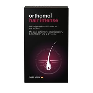 Orthomol Hair Intense (Ортомол Хэйр Интенс) — новый комплекс витаминов и микроэлементов для красивых и здоровых волос Различные внутренние и внешние воздействия могут ухудшить рост волос в течение жизни и привести к их повреждению и выпадению. Поэтому важно обеспечить корни волос и волосковые клетки необходимыми питательными веществами. Только Orthomol Hair Intense объединяет важные питательные микроэлементы (цинк, селен и медь), витамины группы B, аминокислоты L-цистеин и L-метионин, а также запатентованный экстракт проса KeraLiacin ®, который, помимо всего прочего, содержит милиацин. Натуральный ингредиент милиацин содержится исключительно в масле проса. Специальный процесс инкапсуляции с полярными липидами делает запатентованный экстракт проса KeraLiacin ® таким особенным для волос и кожи. Терапевтический эффект Orthomol Hair Intense: биотин, цинк и селен — помогают поддерживать состояние здоровых волос медь — способствует нормальной пигментации волос и профилактики развития седины цинк, селен и медь — помогают защитить клетки от окислительного стресса тиамин (витамин B1), витамин B6, витамин B 12, биотин, пантотеновая кислота и медь — способствуют нормальному энергетическому обмену витамин B6 — способствует нормальному синтезу цистеина пантотеновая кислота способствует нормальному синтезу и нормальному метаболизму стероидных гормонов, витамина D и некоторых нейротрансмиттеров экстракт проса KeraLiacin® — питает волосы изнутри, ускоряет рост волос и делает их более здоровыми и красивыми L-цистеин — улучшает структуру волос, укрепляет стержень волоса L-метионин — необходим для синтеза L-цистеина; устраняет выпадение и ломкость волос