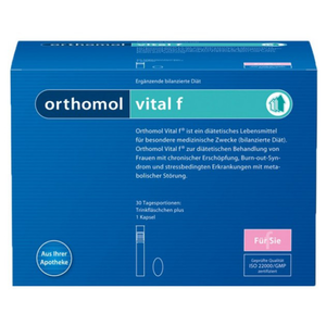 Витаминный комплекс Ортомол Витал ф разработан специально для женщин. Его предназначение – борьба со стрессом и его последствиями, такими как переутомление, раздражительность, апатия и расстройства сна. Комплекс содержит витамины и микроэлементы, которые стимулируют обменные процессы, нормализуют работу нервной системы, а также поддерживают здоровье костей и зубов. вещества, стимулирующие обменные процессы и нормализующие работу нервной системы – витамины С, B1, B2, B6 и B12, пантотеновая и никотиновая кислоты, биотин, соединения магния, йода, меди и марганца; антиоксиданты – витамины С, Е и B2, соединения цинка, селена, меди и магния; соединения кальция, обеспечивающие здоровье костей и зубов.