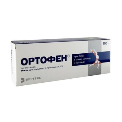 Мазь для наружного применения белого или белого с сероватым или кремоватым оттенком цвета, однородная, со слабым специфическим запахом. Фармакологическое действие НПВС для наружного применения, производное фенилуксусной кислоты. Оказывает противовоспалительное и анальгезирующее действие. Механизм действия обусловлен ингибированием активности ЦОГ-1 и ЦОГ-2, что приводит к нарушению метаболизма арахидоновой кислоты и синтеза простагландинов, являющихся основным звеном в развитии воспаления. При наружном применении приводит к исчезновению или ослаблению болей в месте нанесения, уменьшает боли в суставах в покое и при движении, а также утреннюю скованность и припухлость суставов. Способствует увеличению объема движений в пораженных суставах. Показания активных веществ препарата Ортофен® Боли в спине при воспалительных и дегенеративных заболеваниях позвоночника (радикулит, остеоартроз, люмбаго, ишиас); боли в суставах (в т.ч. суставы пальцев рук, коленные) при ревматоидном артрите, остеоартрозе; боли в мышцах (вследствие растяжений, перенапряжений, ушибов, травм); воспаление и отечность мягких тканей и суставов вследствие травм и при ревматических заболеваниях (тендовагинит, бурсит, поражения периартикулярных тканей).