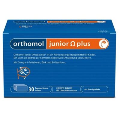 Бренд Ортомол (Orthomol) — витамины направленного действия.ОРТОМОЛЬ ДЖУНИОР ОМЕГА ПЛЮС /ЖЕВАТЕЛЬНЫЕ ИРИСКИ/ КУРС 30 ДНЕЙ — ортомолекулярный витаминный комплекс для нормального развития мозга у детей.Ортомол Джуниор Омега плюс комплекс сложных витаминов, предназначенный для профилактики и нутритивной терапии нарушений когнитивного развития у детейПод когнитивным развитием Orthomol Junior Omega plus понимают развитие всех видов мыслительных процессов у детей, таких как восприятие, память, формирование понятий, решение задач, воображение и логика.В детском комплексе Orthomol junior omega plus сбалансировано подобраны все необходимые элементы, такие как омега 3, биотин, витамины В12, В6, В2, В1, магний, железо, цинк и многие другие полезные добавки для развития памяти, мозговой активности и высокой обучаемости.Препарат Ортомол Джуниор Омега плюс является сбалансированной биологически активной добавкой к пище для детейСодержание биологически активных веществ, мг/ириска (± 20%):витамин С — 16,7,витамин Е — 3,3,витамин В1 — 0,2,витамин В2 — 0,23,витамин В6 — 1,0,витамин В12 — 0,33 мкг,никотинамид — 2,0,пантотеновая кислота — 1,3,фолиевая кислота — 33,3 мкг,биотин — 5,0 мкг,магний — 36,7,цинк — 3,3,железо — 0,76,ПНЖК омега-3 — 125,0,докозогексаеновая кислота — 100,0Orthomol junior Omega plus — витаминный комплекс, разработанный специально для детей. Способствует правильному, сбалансированному развитию мозга и формированию нервной системы у детей