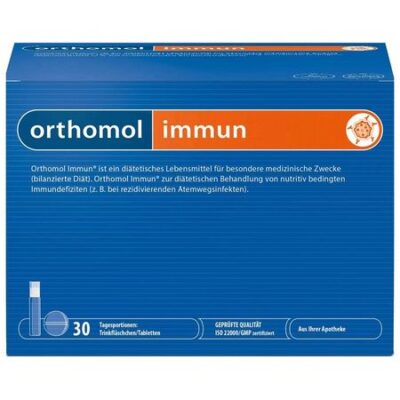 Бренд Ортомол (Orthomol) — витамины направленного действия.Название происходит от греческого слова ortho — «правильный» и латинского moles — «масса» и принадлежит нобелевскому лауреату по химии Лайнусу Полингу. Изучая физиологию человека, Лайнус пришёл к выводу, что большинство хронических болезней обусловлено нехваткой витаминов и микроэлементов. Присутствие в организме «правильной массы» этих вещест помогает сохранить здоровье и улучшить состояние во время болезни.Фармацевтические компании творчески развили идеи Полинга. Продуктовая линейка Ортомол включает 28 комплексов для мужчин и женщин, любого возраста и образа жизни. Каждый витаминный комплекс предназначен для решения конкретных задач. Этим обусловлена эффективность витаминов Ортомол: улучшение самочувствия наступает почти сразу, излечение болезни происходит после двух-трёх курсов принятия витаминов.ОРТОМОЛЬ ИММУН /ЖИДКОСТЬ + ТАБЛЕТКИ/ КУРС 30 ДНЕЙ (Orthomol Immun) — инновационный препарат для поддержания иммунитетаОбласть применения Ортомол Иммун: Иммуноукрепляющий ортомолекулярный препарат, обеспечивающий нормальную работу иммунной системы, активизирует защиту при контакте с враждебными человеческому организму бактериями и вирусами, для профилактики и укрепления иммунной системы, людям часто страдающие гриппом, простудой и ОРЗ. Это витаминный комплекс вспомогательного типа, который рекомендован к применению как дополнительное питание при иммунодефиците. Очень часто Ортомол Иммун назначают после лучевой терапии или химиотерапии для восстановления иммунной системы. Он помогает укреплять и поддерживать иммунную систему и справляться с заболеваниями и стрессами. Воспаления, запущенная инфекция, астма, аллергия, и даже старость ? вот показания к применению этого уникального витаминного комплекса.Дозировка минералов, антиоксидантов и микроэлементов в Ортомол Иммун четко сбалансирована.В состав препарата входят витамины С, Е, группы В, в которых особенно сильно нуждается организм во время болезни.Иммун рекомендовано принимать для профилактики ОРВИ, гриппа, ОРЗ, для борьбы с вирусными инфекциями всех типов. витамины и микроэлементы, такие как витамин С, витамин D, цинк, селен, медь, фолиевая кислота, витамин А, витамин В2 и витамина B12, способствуют нормальной функции иммунной системы.Цинк обладает функций деления клеток, витамин А способствует функции клеточной специализации.Реакция иммунной системы также чувствительна к свободным радикалам.Антиоксидантами, способными улавливать свободные радикалы являются: витамин С, витамин Е, витамин В2, а также цинк, селен, медь и марганец.Они способствуют окислительному стрессу и защищают клетки.Слизистая оболочка дыхательных путей, играет важную роль в качестве барьера против всех видов микробов.Витамин А, витамин В2, биотин и ниацин способствуют сохранению нормального состояния слизистых оболочек.Содержание биологически активных веществ, мг/ табл. (450 мг): железо — 5,76-8,64, фолиевая кислота — 0,48-0,6, пантотеновая кислота — 6,4-8,0Содержание биологически активных веществ, мг/ табл. (500 мг): йод — 0,12-0,18Содержание биологически активных веществ, мг/ флакон (20 мл): каротиноиды (в т.ч. бета-каротин, ликопин, лютеин) — 4,0-6,0, витамин А — 0,36-0,54, витамин Д3 — 0,004-0,006, витамин Е — 120,0-150,0, витамин К — 0,048-0,072, витамин С — 720,0-900,0, витамин В1 — 4,0-5,