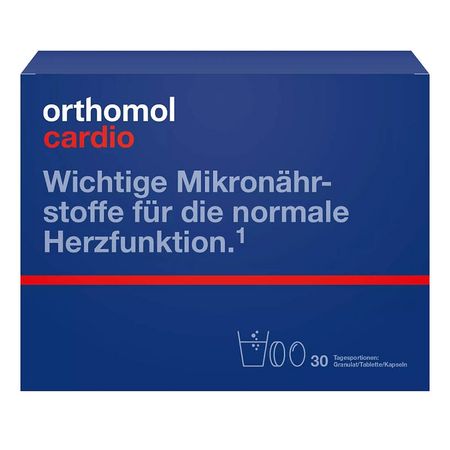 Orthomol Cardio удовлетворяет в полном объеме повышенную потребность тела человека в необходимых для нормальной жизнедеятельности питательных элементах, что особенно важно для людей, имеющих нарушения в работе сердечно-сосудистой системы. Помимо этого, витаминный комплекс Orthomol Cardio рекомендуется принимать и в профилактических целях для предотвращения развития сердечной недостаточности в будущем.В этом мультивитаминном препарате подобраны такие элементы, которые обеспечивают полноценное питание сердечной мышцы и способствуют ее бесперебойной работе. Прием комплекса Ортомол Кардио помогает укрепить стенки сосудов, а также улучшает клеточное и мышечное питание.Композиция препарата включает повышенную концентрацию таких витаминов, как C, B1, B2, B6, В3 и E. Одним из главных действующих веществ препарата является коэнзим Q10, который благотворно влияет на энергетический метаболизм клеток, а также способствует хорошему кровообращению.В составе препарата Ортомол Кардио имеются элементы, которые замедляют развитие атеросклероза, а также в целом благотворно влияют на работу сосудистой системы и органов кровообращения. Именно эти вещества дают сердцу ту энергию, которая нужна ему для оптимальной работы каждый день.По такому же принципу действует и коэнзим Q10. Примечательно, что сердечная мышца, которая в силу определенных причин не может работать со 100%-й эффективностью, увеличивает свою продуктивность благодаря взаимной работе этих двух микроэлементов. Еще один положительный эффект от регулярного приема коэнзима Q10 заключается в том, что он насыщает ткани кислородом, что в целом омолаживает не только мышечные ткани, но и весь организм.Следующее действующее вещество препарата Orthomol Cardio активные вещества из какао-бобов. Они являются антиоксидантами, поэтому борются с находящимися в организме свободными радикалами. Это защищает сосуды и способствует нормализации кровяного давления.Входящие в состав витамины группы В существенно снижают концентрацию гомоцистеина (эти вещества особым образом преобразуют его), который, если его содержание высоко, увеличивает кровяное давление, что в конечном счете может привести к появлению различных сосудистых заболеваний.Витамины С и Е, которые являются антиоксидантами, не дают развиваться атеросклерозу, уменьшают риск апоплексического удара и инфаркта.