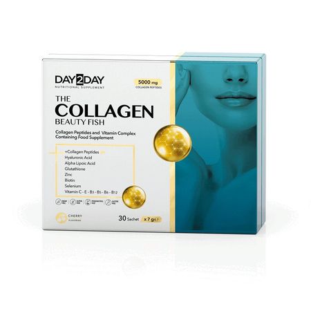 Day2Day The Collagen Beauty Fish — содержит гидролизованные пептиды коллагена I типа (рыбьего) в дозировке 5 000 мг, дополненные витаминно-минеральным комплексом. Благодаря сбалансированному составу, продукт способствует повышению упругости и плотности кожи, поддерживает здоровье и красоту кожи, волос и ногтей, а также укрепляет иммунную систему. Он также содержит L-глютатион, альфа-липоевую и гиалуроновую кислоты, эластин, селен, которые являются важными ингредиентами для красоты и состояния кожи. Полезные свойства комплекса Day2Day The Collagen Beauty Fish: • Способствует повышению упругости и плотности кожи • Способствует укреплению структуры волос и ногтей • Поддерживает здоровье суставов и связок Показания: рекомендуется в качестве биологически активной добавки к пище. Форма выпуска: порошок в саше-пакетах Продолжительность приема: 1 месяц. При необходимости прием можно повторить. Противопоказания: индивидуальная непереносимость компонентов, беременность, кормление грудью. Перед применением рекомендуется проконсультироваться с врачом. Особые указания: биологически активная добавка (БАД) к пище. Не является лекарственным средством. Условия хранения: в сухом, защищенном от попадания прямых солнечных лучей, недоступном для детей месте при температуре не выше 25 °С.