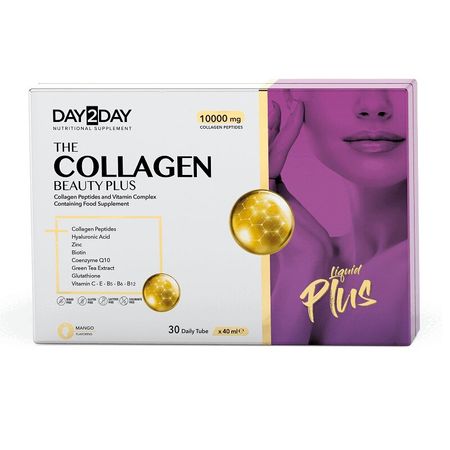 Day2Day The Collagen Beauty Plus содержит гидролизат коллагена I типа (бычий) в дозировке 10 000 мг, представленный в форме высокобиодоступных пептидов. Формула дополнительно усилена витаминно-минеральным комплексом, гиалуроновой кислотой, экстрактом зеленого чая, а также антиоксидантами — коэнзимом Q-10 и L-глутатионом. Представлен в готовой к употреблению жидкой форме с приятным вкусом манго. Day2Day Collagen Beauty является обладателем золотой медали Singapore Taste Awards за превосходный манговый вкус. Полезные свойства комплекса Day2Day The Collagen Beauty Plus: • Способствует повышению упругости и плотности кожи • Способствует укреплению структуры волос и ногтей • Поддерживает здоровье суставов и связок • Способствует заживлению ран и регенерации тканей Показания: рекомендуется в качестве биологически активной добавки к пище. Форма выпуска: жидкость в тубах Противопоказания: индивидуальная непереносимость компонентов, беременность, кормление грудью. Перед применением рекомендуется проконсультироваться с врачом. Особые указания: биологически активная добавка (БАД) к пище. Не является лекарственным средством. Условия хранения: в сухом, защищенном от попадания прямых солнечных лучей, недоступном для детей месте при температуре не выше 25 °С. Вскрытая туба хранению не подлежит.