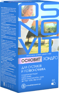 Бренд ОСНОВИТ — линия витаминно-минеральных комплексов, разработанная для поддержания правильного функционирования как отдельных органов, так и целых систем организма. Важнейшие для здоровья компоненты содержатся во всех препаратах линии в сбалансированных физиологических дозировках, которые не создают избыточной лекарственной нагрузки.ОСНОВИТ — только самое основное для здоровья!ОСНОВИТ ХОНДРО ДЛЯ СУСТАВОВ И ПОЗВОНОЧНИКА — Биологически активная добавка (БАД) к пище — это комплекс активных хондропротекторов: глюкозамина, хондроитина, экстракта коры белой ивы и органической серы (МСМ).Действуя вместе, эти компоненты способствуют:• естественному обновлению хрящевой ткани;• замедлению возрастных деструктивных изменений в суставах;• уменьшению болевых ощущений в суставах и позвоночнике.Содержание в 4-х капсулах (суточной дозировке):хондроитинсульфат 800 мг 133% адекватного уровня потребленияглюкозамин 1000 мг 143% адекватного уровня потребленияметилсульфонилметан 50 мг Адекватный уровень потребления не установленПроблемы с суставами, снижение двигательной активности, постоянный дискомфорт и болезненные ощущения в коленях и позвоночнике считаются в нашем обществе, ксожалению, обычными возрастными явлениями.Но возраст совершенно не помеха активной и здоровой жизни при условии того, что наши суставы и прилегающие к ним ткани здоровы.Считается, что одной из основных причин быстро развивающегося разрушения суставного хряща и околосуставных тканей может являться наличие хронического воспаления. Это значит, что основные усилия следует направить на то, чтобы поспособствовать его устранению, либо своевременной профилактике.Второй немаловажный фактор здоровья суставов — это целостность соединительной ткани. С возрастом, а также при тяжелых физических нагрузках, травмах и воспалении основные компоненты, принимающие участие в синтезе соединительной ткани и запускающие процесс регенерации хрящевой ткани (хондроитин и глюкозамин), вырабатываются совсем в малых количествах и требуют восполнения дефицита извне.АКТИВНЫЕ ИНГРЕДИЕНТЫ:Входящие в состав компоненты способствуют естественному обновлению хрящевой ткани, замедлению возрастных деструктивных изменений в суставах, уменьшению болевых ощущений в области суставов.Хондроитинсульфат натрия необходим организму для естественного обновления хрящевой ткани за счет синтеза собственного гиалурона и коллагена. Обладает противовоспалительной активностью и способен оказывать влияние на метаболизм хрящевой ткани, способствуя нормализации обменных процессов и ее регенерации.Глюкозамин защищает суставные ткани от дегенеративных изменений, вызванных возрастными, медикаментозными и другими факторами. Действует как стимулятор процесса восстановления поврежденного хряща, влияет на обмен веществ в хрящевой ткани и предотвращает ее разрушение. Также отмечается противовоспалительное действие глюкозамина. которое устраняет отек, а также повышенную чувствительность и болезненностьсуставов.Органическая сера МСМ (метилсульфонилметан) обеспечивает лучшее усвоение глюкозамина и хондроитина. Стабилизирует прочность коллагеновых молекул, обладает анальгетическим действием, снижает выраженность воспалительных процессов в суставных тканях, поддерживает локал