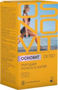 ОСНОВИТ* — линия витаминно-минеральных комплексов, разработанная для поддержания правильного Функционирования как отдельных органов, так и целых систем организма. Важнейшие для здоровья компоненты содержатся во всех препаратах линии в сбалансированных физиологических дозировках, которые не создают избыточной лекарственной нагрузки.ОСНОВИТ* — только самое основное для здоровья!ОСНОВИТ® ОСТЕО ПРИРОДНАЯ ПРОЧНОСТЬ КОСТЕЙКостная ткань задумана природой как самый прочный органический материал. Исследования показали, что по своей прочности кость превосходит бетон, а по ряду параметров сопоставима даже со сталью! Разумеется, это справедливо только для здоровых костей абсолютно здорового организма, что в настоящее время, увы, встречается нечасто.Нанести ущерб структуре костей может множество факторов: от неправильно подобранной диеты, чрезмерных физических нагрузок при занятиях спортом до системных эндокринных заболеваний. С возрастом также происходит снижение степени минерализации костной ткани и интенсивности ее ремоделирования, из-за чего люди старшего возраста более подвержены переломам. Именно поэтому важно своевременно восполнять потерю организмом минеральных веществ, в частности кальция.И главное — одного кальция для поддержки здорового состояния костной системы недостаточно!Для правильного усвоения этого макроэлемента необходимы ещё два важнейших компонента — витамины D3 и К2.Действуя в комплексе, они выполняют взаимосвязанные задачи: помогаютусвоить поступающий с пищей и препаратами кальций; направить кальций вте органы, которые в нём нуждаются; предотвратить отложение кальция в суставах, почках и сосудахОсновит® Остео Природная прочность костей содержит комбинацию кальция, витаминов D3 и К2, которая считается наиболее эффективной для поддержания необходимой степени минерализации костной ткани.Aquamin (Аквамин) — один из ключевых компонентов препарата. Этот природный мультиминеральный комплекс разработан в Норвегии на основе красных морских водорослей Lithothamnion corallioides. Он содержит кальций и магний в максимально биодоступной форме, а также ещё более 70-ти необходимых организму полезных компонентов, включая цинк и селен. Их совместное действие естественным образом обеспечивает прочность костной ткани и зубной эмали, а также благоприятно влияет на состояние кожи, волос и ногтей.Витамин D3 (холекальциферол) — один из ключевых витаминов, оказывающий влияние на состояние костно-мышечной системы, кожи, щитовидной железы и множества метаболических процессов организма. Одним из них является усвоение кальция, критически необходимого для поддержания природной прочности костей и зубов. Витамин D3 повышает всасывание кальция и фосфора в кишечнике, увеличивает их реабсорбцию почками, способствует увеличению минерализации и упругости костной ткани. Также холекальциферол полезен и для здоровья опорно-двигательного аппарата в целом: нормализует нейромышечную передачу, предотвращает миопатии на фоне нарушения минерального обмена (проявляющиеся мышечной слабостью, трудностями при ходьбе и поддержании равновесия,атакжесклонностьюкпадениям).Витамин К2 (менахинон) крайне важен для балансировки процесса метаболизма кальция, иначе организм может доставить поступивший в него кальций не в кости и зубы, а во 