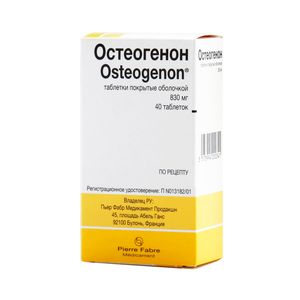 Показания к применению Профилактика и лечение первичного остеопороза различной этиологии (пременопаузный, менопаузный, сенильный), профилактика и лечение вторичного остеопороза различной этиологии (обусловленного ревматоидным артритом, заболеваниями печени и почек, гипертиреозом, гиперпаратиреозом, несовершенным костеобразованием, применением ГКС, гепарина, иммобилизацией), коррекция остеопении и нарушений фосфорно-кальциевого обмена (в т.ч. при беременности и в период грудного вскармливания), ускорение заживления переломов костей.Применение при беременности и кормлении грудьюОстеогенон может применяться при беременности и в период грудного вскармливания по показаниям после консультации врача.Противопоказания Тяжелая почечная недостаточность, гемодиализ, выраженная гиперкальциурия, детский возраст, повышенная чувствительность к компонентам препарата.Побочное действие В очень редких случаях (<,1/1 000 000) возможны: аллергические реакции, при длительном применении &mdash, гиперкальциемия, гиперкальциурия.СоставВ 1 таблетке препарата в Составе оссеин-гидроксиапатитного комплекса содержится 291мг оссеина (неколлагеновых пептидов и белков — 75мг, коллагеновых белков &ndash, 216 мг) и 444 мг гидроксиапатита (кальция &ndash, 178мг, фосфора &ndash, 82мг). Состав оболочки: гипромеллоза, титана диоксид, макрогол, тальк, железа оксид желтый.Взаимодействие с другими препаратамиОстеогенон замедляет всасывание препаратов железа, бисфосфонатов и антибиотиков группы тетрациклина, поэтому при одновременном применении с этими препаратами интервал времени между их приемом должен составлять не менее 4 ч. При одновременном применении Остеогенона с витамином D или тиазидными диуретиками врачу следует оценить степень риска развития гиперкальциемии вследствие усиления резорбции кальция.