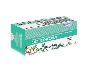 Остеоколл (osteocoll) имплантат коллаген-содержащий для периартикулярного введения — представляет собой чистый бесцветный раствор. Представляет собой имплант коллаген-содержащий для периартикулярного введения, который способствует увеличению объема движений благодаря замедлению процессов деградации хрящевой ткани суставных поверхностей и восстановлению повреждений, возникших в результате: старения, нарушения осанки, сопутствующих хронических заболеваний, ушибов и травм, токсических поражений хрящевой ткани.