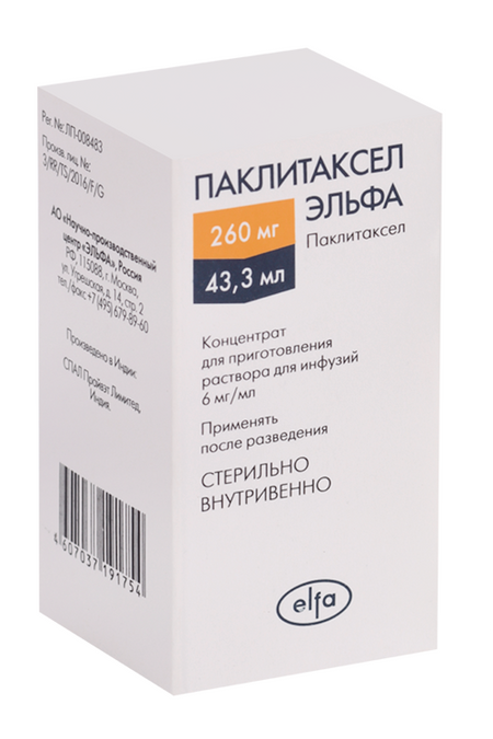Главная » Аптека Паклитаксел Эльфа 6 мг/мл, 43,3 мл, концентрат для приготовления раствора для инфузий Просмотров 9 СПАЛ Прайвэт Лимитед