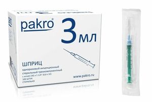 Шприц 3-х компонентный объемом 3 мл – это медицинское изделие, которое используется для инъекций. Шприц стерильный инъекционный имеет индивидуальную упаковку и предназначен для одноразового использования. Он выполнен из качественного и безопасного материала. Игла 23G (0,6х32мм) — съёмная. Игла при введении не травмирует ткани, за счёт покрытия специальной смазкой. Положение Луер-крепления (конуса цилиндра) шприца — концентрическое (расположено по центру цилиндра шприца). Прозрачный цилиндр облегчает контроль объема и прозрачности медикамента. Шприцы имеют высокую точность и позволяют контролировать дозу препарата. Индивидуальная упаковка обеспечивает сохранность стерильности. Шприцы трехкомпонентные – это надежный и удобный инструмент для проведения медицинских процедур в домашних условиях или в медицинских учреждениях.В шприцах Pakro Medical достигнута высокая степень плавности движения поршня, введение лекарственного препарата проводится без «рывков».Прозрачный цилиндрический корпус с четкой, устойчивой к стиранию шкалой, манжета из нетоксичного резинового компаунда зеленого цвета с конусом, исключающий «мертвый объем», цветоконтрастный (зеленый) шток поршня — все это позволяет точно дозировать и визуально контролировать качество раствора во время использования шприца.Иглы, которыми укомплектованы шприцы Pakro Medical, атравматичные, благодаря оригинальной технологии обработки.1.Игла изготовлена из специальной хирургической стали, что позволяет сохранить прочность при минимальной толщине стенки.2.Острие иглы имеет заточку в трех плоскостях, что обеспечивает безболезненный укол.3.Ультразвуком с поверхности иглы удаляются микрочастицы металла, и производится шлифовка.4.Поверхность иглы покрыта специальной силиконовой смазкой, что позволяет достичь минимального коэффициента трения иглы с тканями в момент ее введения.При этом из внутреннего просвета остатки смазки выдуваются, благодаря чему обеспечивается максимальная пропускная способность иглы.Все это делает инъекцию практически атравматичной и безболезненной. Ткани при этом не разрезаются, а раздвигаются.СТЕРИЛЬНО. АПИРОГЕННО. НЕ ТОКСИЧНОБез латексаСтерилизовано оксидом этилена.ДЛЯ ОДНОКРАТНОГО ПРИМЕНЕНИЯ.Тип наконечника ЛУЕР.PAKRO Шприц одноразовый, стерильный трёхкомпонентный, объёмом 3 мл, c иглой 23G х 1 1/4″ (0,6 х 32)Игла съёмная.