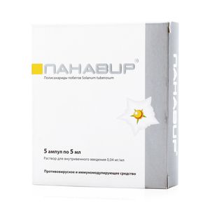 Показания к применениюГерпесвирусные инфекции различной локализации (в том числе рецидивирующий генитальный герпес, герпес Зостер и офтальмогерпес).Вторичные иммунодефицитные состояния на фоне инфекционных заболеваний.Цитомегаловирусная инфекция, в том числе у пациенток с привычным невынашиванием беременности.Применяется у женщин с хронической вирусной инфекцией и интерферонодефицитным состоянием на этапе подготовки к беременности.Хроническая цитомегаловирусная инфекция в стадии обострения у беременных во II и III триместре в составе комплексной терапии.Папилломавирусная инфекция (аногенитальные бородавки) в составе комплексной терапии.Язвенная болезнь желудка и двенадцатиперстной кишки у пациентов с длительно рубцующимися язвами и симптоматическими язвами гастродуоденальной зоны в составе комплексной терапии.Клещевой энцефалит с целью снижения вирусной нагрузки и снятия неврологической симптоматики (анизорефлексии, снижения рефлексов, болезненности точек выхода черепно-мозговых нервов, нистагма) в составе комплексной терапии.Ревматоидный артрит, сочетанный с герпесвирусной инфекцией у иммунокомпрометированных больных (для усиления анальгетического и противовоспалительного эффекта основной терапии), в составе комплексной терапии.ОРВИ и грипп в составе комплексной терапии.Панавир применяют в комплексной терапии хронического бактериального простатита.Применение при беременности и кормлении грудьюС осторожностью применять при беременности. Противопоказан в период лактации.ПротивопоказанияИндивидуальная непереносимость. Панавир не следует применять больным в случае наличия аллергии к составным компонентам препарата: к глюкозе, маннозе, рамнозе, арабинозе, ксилозе.Период лактации. Детский возраст до 12 лет.Побочное действиеИндивидуальная непереносимость и повышенная чувствительность к составляющим препарата.СоставДействующее вещество: Картофеля побегов экстракт (Solanum tuberosum cormus extract)Концентрация действующего вещества (мг): 0.04Взаимодействие с другими препаратамиКлинически значимое лекарственное взаимодействие препарата не установлено.