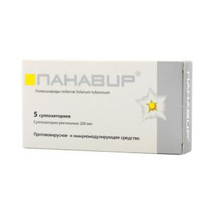 Показания к применениюВ составе комплексной терапии клещевого энцефалита (снижение вирусной нагрузки и снятие неврологической симптоматики, в т.ч. анизорефлексия, снижение рефлексов, болезненность точек выхода черепно-мозговых нервов, нистагм).В составе комплексной терапии: герпесвирусные инфекции различной локализации (в т.ч. рецидивирующий генитальный герпес, Herpes zoster и офтальмогерпес).Снижение иммунитета в сочетании с инфекционными заболеваниями.Цитомегаловирусная инфекция в сочетании с привычным невынашиванием беременности.В составе комплексной терапии: папилломавирусная инфекция (аногенитальные бородавки).Применение при беременности и кормлении грудьюС осторожностью применять при беременности. Противопоказан в период лактации.ПротивопоказанияТяжелые заболевания почек и селезенки, период лактации, детский возраст, повышенная чувствительность к растительному средству.Побочное действиеВозможно: аллергические реакции.СоставВ 1 суппозории: Экстракт побегов картофеля (панавир) 0.0002 мг.Вспомогательные вещества: полиэтиленоксид 1500 (макрогол 1500) 1.2599 г, полиэтиленоксид 400 (макрогол 400) 0.1399 г.Взаимодействие с другими препаратамиНе выявлено.
