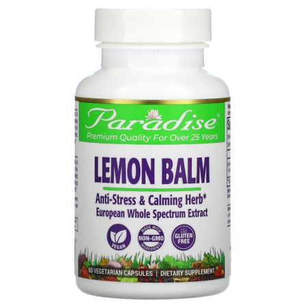 (Melissa officinalis L.)600 мг**** Суточная норма не определена. Премиальное качество уже более 25 лет Растение для борьбы со стрессом с расслабляющим эффектом Европейский экстракт полного спектра Веганский продукт Изготовлено из ингредиентов без ГМО Без глютенаПищевая добавкаEnhancing Nature’s Miracles Since 1994 Имеет регистрацию надлежащей производственной практики (GMP). Зарегистрировано FDAКачество, чистота и эффективностьПродукты Paradise получают награды от Best of Supplements Awards как лучшие добавки вот уже более десяти лет. Мы стремимся использовать сверхчистые ингредиенты премиального качества, которые соответствуют самым высоким стандартам. Мы никогда не добавляем ненужные наполнители, связывающие вещества, консерванты или агенты текучести в наши продукты в процессе инкапсуляции. Преимущества активных экстрактов полного спектраНаши активные экстракты содержат полный спектр природных компонентов и извлекаются без использования токсичных растворителей и/или агрессивных химикатов. Данный уникальный метод позволяет выявить истинную сущность растения в целом, сохраняя при этом необходимую концентрацию высокоактивных и биодоступных питательных фитонутриентов.
