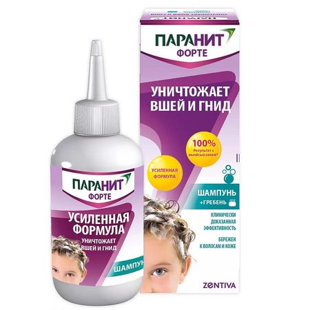 ПАРАНИТ ФОРТЕ УСИЛЕННАЯ ФОРМУЛА ШАМПУНЬ СРЕДСТВО ПЕДИКУЛИЦИДНОЕ +ГРЕБЕНЬ — шампунь уничтожает вшей и гнид Состав6 1 Aqua 59.86% 2 Texapon NSO 12.50% 3 Sodium chloride 10% 4 Dehyton K cos 6.00% 5 Diglycerin S 5.00% 6 Levenol C-301 2.00% 7 Sensomer Cl-50 1.50% 8 Hydroxyethylcellulose Natrosol 250 HR PC 1,20% 9 Geogard 221 0.80% 10 Silicium dioxide colloidal 0.50% 11 Osmolice 1627183 0.40% 12 Sunflower oil bio 0.20% 13 Potassium hydroxide 0.040% Итого 100% ПЕРЕД ПРИМЕНЕНИЕМ ОЗНАКОМЬТЕСЬ С ИНСТРУКЦИЕЙ. О головных вшах: Головная вошь — это маленькое (3-4 мм длиной) бескрылое насекомое с 3-мя парами ножек, с помощью которых она проворно передвигается и крепко удерживается на волосах. Головные вши живут исключительно в волосяном покрове головы и питаются кровью. При укусах вши выделяют слюну, которая, попадая в ранку, вызывает аллергическую реакцию: раздражение и зуд. В течение жизни самка откладывает до 300 яиц, которые называются гнидами. На 7-й день из гнид происходит вылупление личинок, которые спустя 10 дней становятся взрослыми особями. Определить заражение головным педикулёзом можно с помощью визуального осмотра и обнаружения гнид в волосах. Гниды неподвижны, поэтому их легче обнаружить, чем вшей. О педикулицидном средстве «Шампунь Паранит Форте Усиленная Формула» Шампунь Паранит Форте Усиленная Формула прошёл исследования, которые подтвердили его эффективность. Средство обладает формулой двойного действия: удушает и обезвоживает вшей, их личинки и гниды. Кроме того, Шампунь Паранит Форте Усиленная Формула удобно использовать: уничтожить вшей и гнид так же просто, как вымыть голову, а содержащиеся в нем кондиционирующие добавки облегчают удаление вшей гребнем. Шампунь Паранит Форте Усиленная Формула не содержит инсектицидов, поэтому у вшей не развивается к нему устойчивость. Исследования средства Шампунь Паранит Форте Усиленная Формула проводились под контролем дерматологов. *В результате клинических исследований доказано, что Шампунь Паранит Форте Усиленная Формула обладает высоким острым действием в отношении головных вшей и обеспечивает 100%-ную гибель насекомых при 60-минутном контакте.