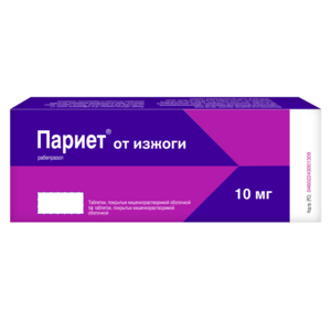 Показания к применениюЯзвенная болезнь желудка в стади обострения и язва анастомоза; язвенная болезнь двенадцатиперстной кишки в стадии обострения; эрозивная гастроэзофагеальная рефлюксная болезнь или рефлюкс-эзофагит; поддерживающая терапия гастроэзофагеальной рефлюксной болезни; неэрозивная гастроэзофагеальная рефлюксная болезнь; синдром Золлингера-Эллисона и другие состояния, характеризующиеся патологической гиперсекрецией; в комбинации с соответствующей антибактериальной терапией для эрадикации Helicobacter pylori у пациентов с язвенной болезнью.Применение при беременности и кормлении грудьюДанных по безопасности применения рабепразола во время беременности нет.Исследования репродуктивности на крысах и кроликах не выявили признаков нарушения фертильности или дефектов развития плода, обусловленных рабепразолом; однако у крыс в небольших количествах препарат проникает через плацентарный барьер. Париет не следует применять при беременности за исключением случаев, когда ожидаемый положительный эффект для матери превосходит возможный вред для плода.Неизвестно, выделяется ли рабепразол с грудным молоком. Соответствующие исследования у кормящих женщин не проводились. Вместе с тем рабепразол обнаружен в молоке актирующих крыс, и поэтому Париет нельзя назначать кормящим женщинам.ПротивопоказанияБеременность; период лактации; детский возраст до 12 лет; гиперчувствительность к рабепразолу, замещенным бензимидазолам или к вспомогательным компонентам препарата.С осторожностью применять у пациентов с тяжелой почечной недостаточностью тяжелой степени, в детском возрасте.Побочное действиеОстрые системные аллергические реакции; тромбоцитопения, нейтропения, лейкопения; гипомагниемия; повышение активности печеночных ферментов,гепатит, желтуха, печеночная энцефалопатия; интерстициальный нефрит; буллезные высыпания, крапивница,мультиформная эритема, токсический эпидермальный некролиз, синдром Стивенса-Джонсона.миалгия, артралгия, гинекомастия.СоставДействующее вещество: Рабепразол (Rabeprazole)Концентрация действующего вещества (мг): 10мг