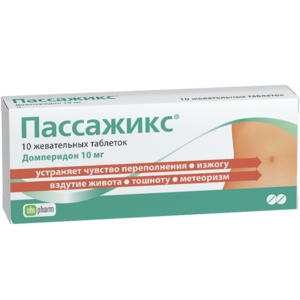 Показания к применениюкомплекс диспептических нарушений на фоне замедленного опорожнения желудка, гастроэзофагеального рефлюкса и эзофагита (чувство переполнения в эпигастрии, ощущение вздутия живота, боль в верхней части живота, отрыжка, метеоризм, изжога с забросом или без заброса желудочного содержимого в полость рта);тошнота и рвота функционального, органического, инфекционного происхождения, вызванные радиотерапией, лекарственной терапией или нарушением диеты, а также на фоне агонистов дофамина в случае их применения при болезни Паркинсона (такими как леводопа и бромокриптин).Применение при беременности и кормлении грудьюПри введении животным в дозах до 160 мг/кг/сут домперидон не оказывал тератогенного действия. Однако, как и большинство лекарственных препаратов, Пассажикс следует назначать во время I триместра беременности, только если его применение оправдано ожидаемой терапевтической пользой.К настоящему времени не имеется данных о повышении риска пороков развития у людей.У женщин концентрации домперидона в грудном молоке в 4 раза ниже, чем соответствующие концентрации в плазме.Неизвестно, оказывает ли этот уровень отрицательное воздействие на новорожденных. Поэтому, если мать принимает Пассажикс, кормление грудью не рекомендуется, за исключением случаев, когда ожидаемая польза оправдывает потенциальный риск.Противопоказанияустановленная непереносимость препарата;пролактинсекретирующая опухоль гипофиза (пролактинома);детский возраст до 5 лет.Не следует применять Пассажикс, когда стимуляция двигательной функции желудка может быть опасной, в т.ч. при желудочно-кишечном кровотечении, механической непроходимости или перфорации.С осторожностью: почечная/печеночная недостаточность; период лактации; беременность.Побочное действиеНаблюдаются редко, отмечались исключительные случаи преходящих спазмов кишечника.Экстрапирамидные явления наблюдаются у детей и при повышенной проницаемости ГЭБ. Эти явления полностью обратимы и спонтанно исчезают после прекращения лечения.Так как гипофиз находится вне ГЭБ, Пассажикс может индуцировать повышение уровня пролактина в плазме. В редких случаях эта гиперпролактинемия может стимулировать появление галактореи, гинекомастии и дисменореи.Отмечались редкие аллергические реакции, такие как сыпь и крапивница.СоставТаблетки жевательные, состав (1 табл.):активное вещество:домперидон — 0,01 гвспомогательные вещества: аспартам; лактитол; ксилитол; магния стеарат; ментол
