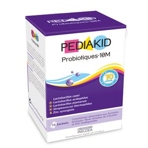 Pediakid® Probiotiques-10M / Пробиотик-10МБаланс кишечной флорыУпаковка: 10 саше-пакетиков для разведения. Комплекс из 4 штаммов (Lactobacillus casei + Lactobacillus acidophilus + Lactobacillus plantarum + Streptococcus thermophilus). Герметичная упаковка гарантирует стабильность всех 10 млрд ферментов. Содержит цинк – микроэлемент, который улучшает работу иммунной системы, активизирует клетки иммунитета и предотвращает развитие микробных инфекций.Плюс продукта Инновационная формула гарантированно концентрированная и стабилизированная.Pediakid Probiotiques-10М / Педиакид Пробиотик-10М был разработан на основе штаммов кисломолочных ферментов, тщательно отобранных для их стабильности, герметичная упаковка гарантирует стабильность всех 10 млрд ферментов без учета хранения в холодильнике.Добавка к пище в виде порошка для разведения на основе кисломолочных заквасок, содержит волокна, инулин из Цикория и биодоступный Цинк..Нормальном функционирование пищеварительной системы это 50 % защиты организма. Содержит 10 млдр. “полезных бактерий” для защиты детского организма. У детей, кишечная флора является незрелой и, следовательно, очень чувствительна к нарушению. Неразнообразное питание, ежедневный стресс или принятие антибиотиков могут нарушить баланс кишечной флоры.Pediakid Probiotiques-10M был специально разработан для восстановления баланса микрофлоры кишечника детей с помощью содержащихся в нем активных ингредиентах: Lactobacillus casei, Lactobacillus acidophilus, Lactobacillus plantarum, Streptococcus thermophilus: кисломолочные ферменты тщательно отобраны и сбалансированы, для оптимального восстановления кишечной микрофлоры.Pediakid Probiotiques-10M содержит Цинк: микроэлемент который улучшает работу иммунной системы, активирует клетки иммунитета и предотвращает развитие микробных инфекций. Форма бисглицинат обладает наилучшей биодоступностью.
