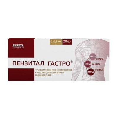 Пензитал Гастро — лекарственный препарат, улучшающий процессы переваривания пищи у взрослых и детей, и тем самым значительно уменьшающий симптомы ферментной недостаточности поджелудочной железы, включая боль в области живота, метеоризм, изменение частоты и консистенции стула. Показания Панкреатические ферменты не абсорбируются из ЖКТ, вследствие чего классические фармакокинетические исследования не проводились. Фармакологическое действие Ферментное средство. Содержит панкреатические ферменты — амилазу, липазу и протеазы, которые облегчают переваривание углеводов, жиров и белков, что способствует их более полному всасыванию в тонкой кишке. При заболеваниях поджелудочной железы компенсирует недостаточность ее внешнесекреторной функции и способствует улучшению процесса пищеварения. Лекарственное взаимодействие При одновременном применении с антацидами, содержащими кальция карбонат и/или магния гидроксид, возможно уменьшение эффективности панкреатина. При одновременном применении с препаратами железа возможно уменьшение абсорбции железа. Возможно снижение всасывания фолиевой кислоты при одновременном применении с препаратами панкреатина. Эффект гипогликемических средств для приема внутрь (таких как акарбоза, миглитол) может снижаться при одновременном применении с препаратами пищеварительных ферментов, содержащих ферменты, расщепляющие углеводы.