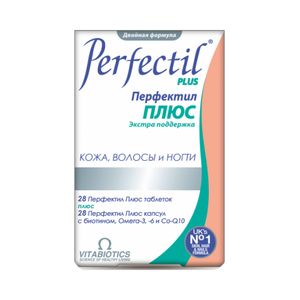 Перфектил Плюс формула состоит из 28 Перфектил таблеток, включающих комплекс витаминов и минералов, для питания кожи, волос и ногтей. Плюс 28 Перфектил капсул, содержащих дополнительный комплекс питательных веществ для дополнительной защиты и питания кожи.Омега-3 рыбий жир: Восстанавливает клетки и предотвращает их от разрушения. Защищает от негативного влияния солнечного излучения, уменьшает и предотвращает дальнейшее образование морщин, поддерживает естественный водный баланс в клетках.Лютеин: Защищает кожу от разрушающего действия свободных радикалов, образующихся в результате УФ-излучения.Масло Бурачника: Является натуральным, растительным источником Омега-3 и Омега-6 ж.к. Эти необходимые жирные кислоты поддерживают естественную увлажненность кожи, оказывая тонизирующий эффект.Масло семян черной смородины: Является самым богатым растительным источником Омега-3 и Омега-6 ж.к. Эти жирные кислоты сохраняют кожу эластичной и упругой.Экстракт Ликопина: Играет важную роль в защите чувствительной кожи от УФ-излучения, которое вызывает преждевременное повреждение кожи.Коэнзим Q10: Является антиоксидантом, понижает активность некоторых энзимов, которые разрушают коллаген кожи.Стандартизованный экстракт виноградных семечек (95%): Содержит антиоксиданты, защищают клетки от разрушающего действия свободных радикалов, поддерживают эластичность кровеносных сосудов, активируя кровообращение.Натуральный витамин Е, витамин С и селен: Антиоксиданты, которые защищают клетки от разрушения, вызванного свободными радикалами, УФ-излучением и загрязнением окружающей среды.Витамин С: Помогает сохранить кожу сильной и эластичной. Также необходим для роста здоровых ногтей.Витамин D3: Необходим для здоровья кожи, костей и общего здорового состояния всего организма.Комплекс витаминов группы В, Фолиевая кислота и железо: Участвуют в формировании клеток крови, кровообращении и транспортировке питательных веществ в дерму.Натуральный каротин: Уменьшает повреждения, вызванные солнцем.Биотин: Ответственен за нормальный рост волос.Хром: Важен для роста сильных волос и формирования волосяных фолликулов.Магний и цинк: Важные минералы, которые помогают уменьшить выпадение волос. Цинк — отвечает за рост сильных и крепких ногтей.Йод: Необходим для образования тироксина — гормона, который отвечает за метаболизм. Отсутствие тироксина может оказать отрицательный эффект на внешний вид кожи, волос и ногтей.Железо: Поддерживает здоровье ногтей.Марганец: Является жизненно важным для здоровья кожи, так как является необходимым в метаболизме и развитии соединительной ткани.