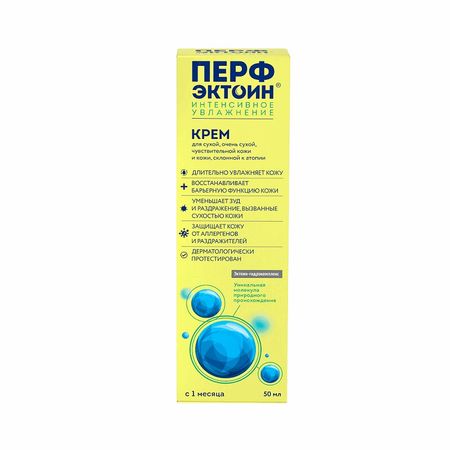ПЕРФЭКТОИН® ИНТЕНСИВНОЕ УВЛАЖНЕНИЕ — уникальный увлажняющий крем на основе 7% эктоина, комплекса липидов и других натуральных компонентов. Способствует интенсивному и длительному увлажнению кожи, снижению зуда, вызванного сухостью кожи и укусами насекомых. Используется для ухода за сухой, очень сухой, чувствительной кожей и кожей, склонной к атопии. Может быть использован на любых участках кожи лица и тела, у детей с 1 месяца и взрослых, включая беременных и кормящих женщин.